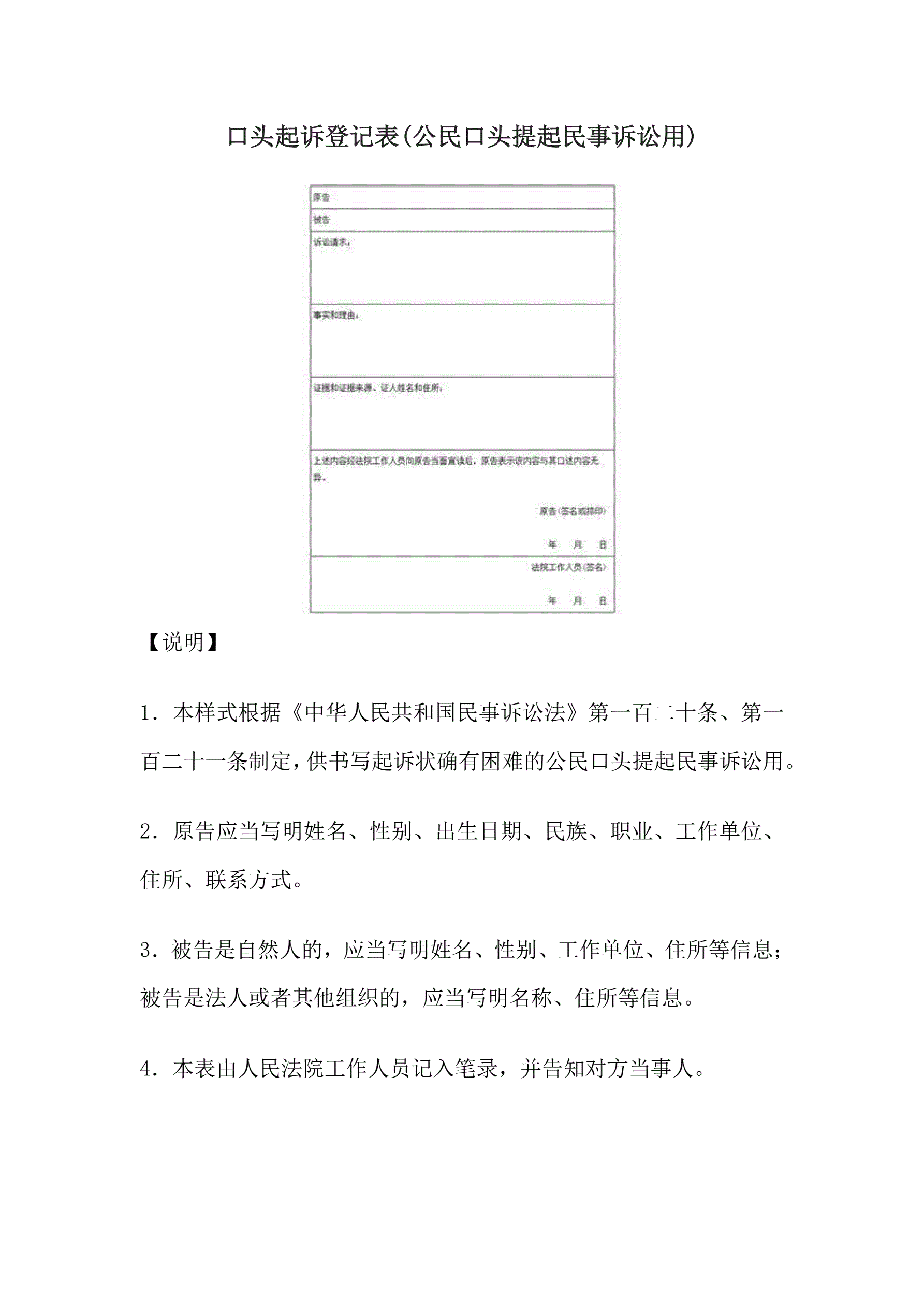 >口头起诉登记表(公民口头提起民事诉讼用)