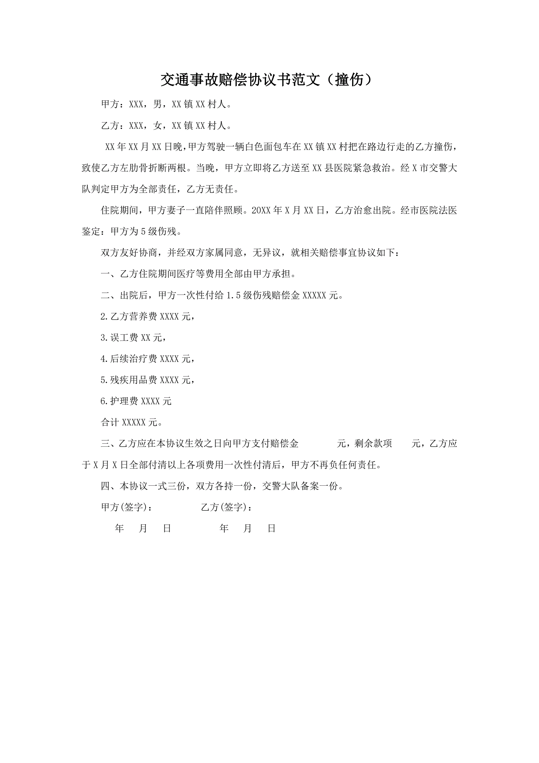>交通事故赔偿协议书(撞伤)