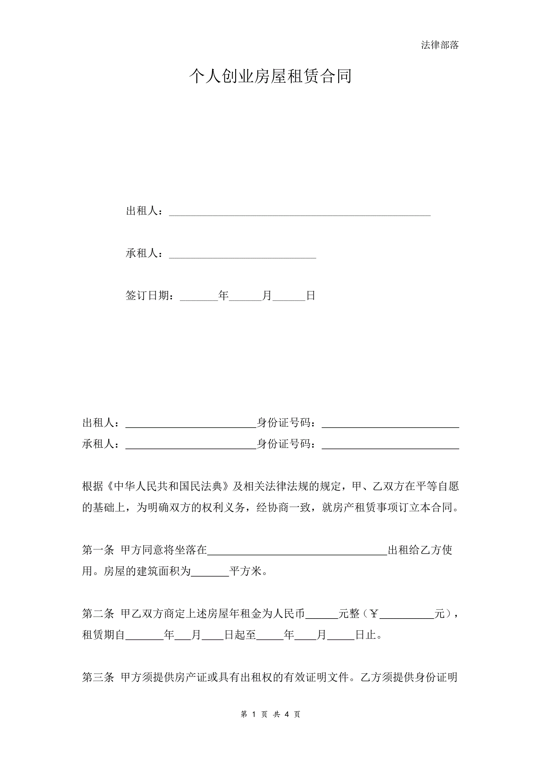 个人创业房屋租赁合同