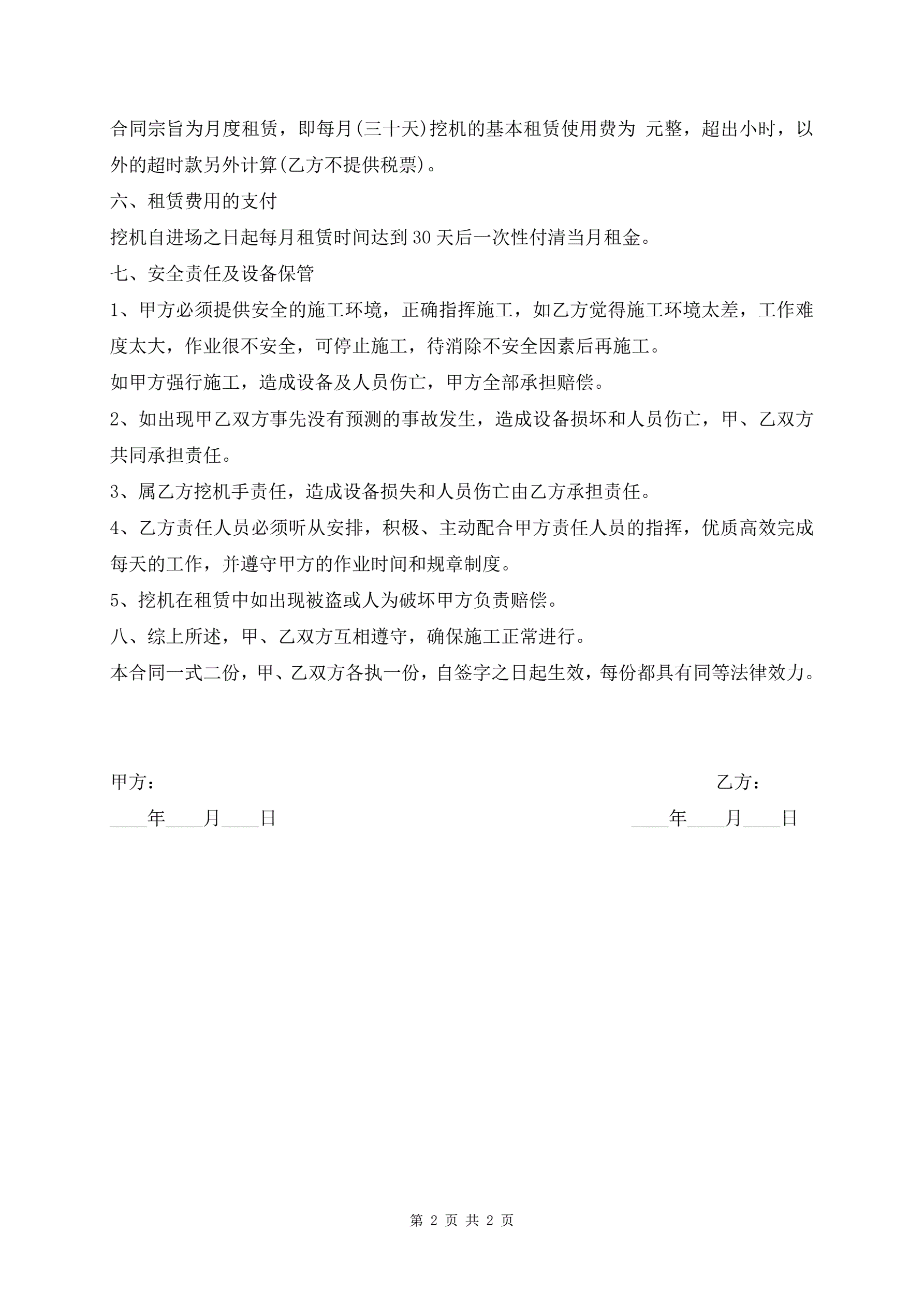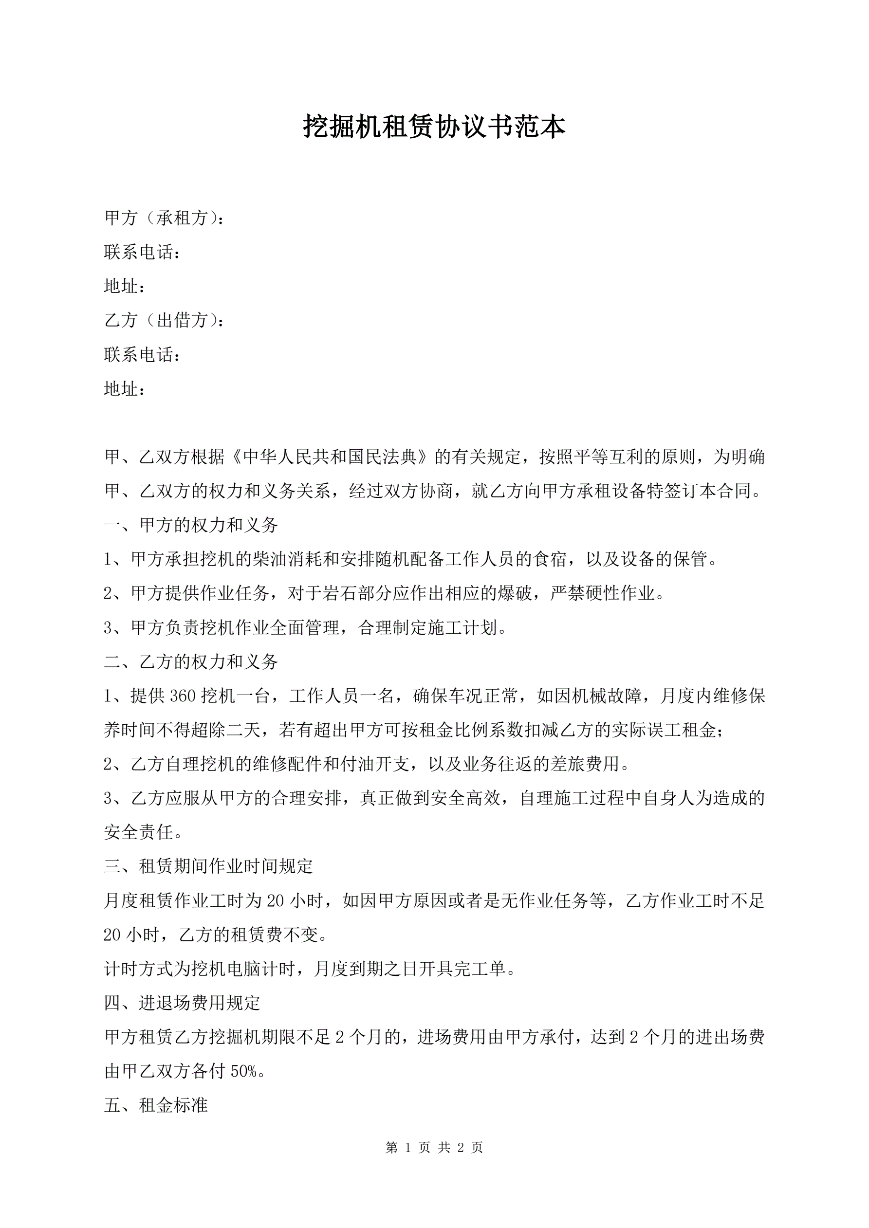 挖掘机租赁协议书范本