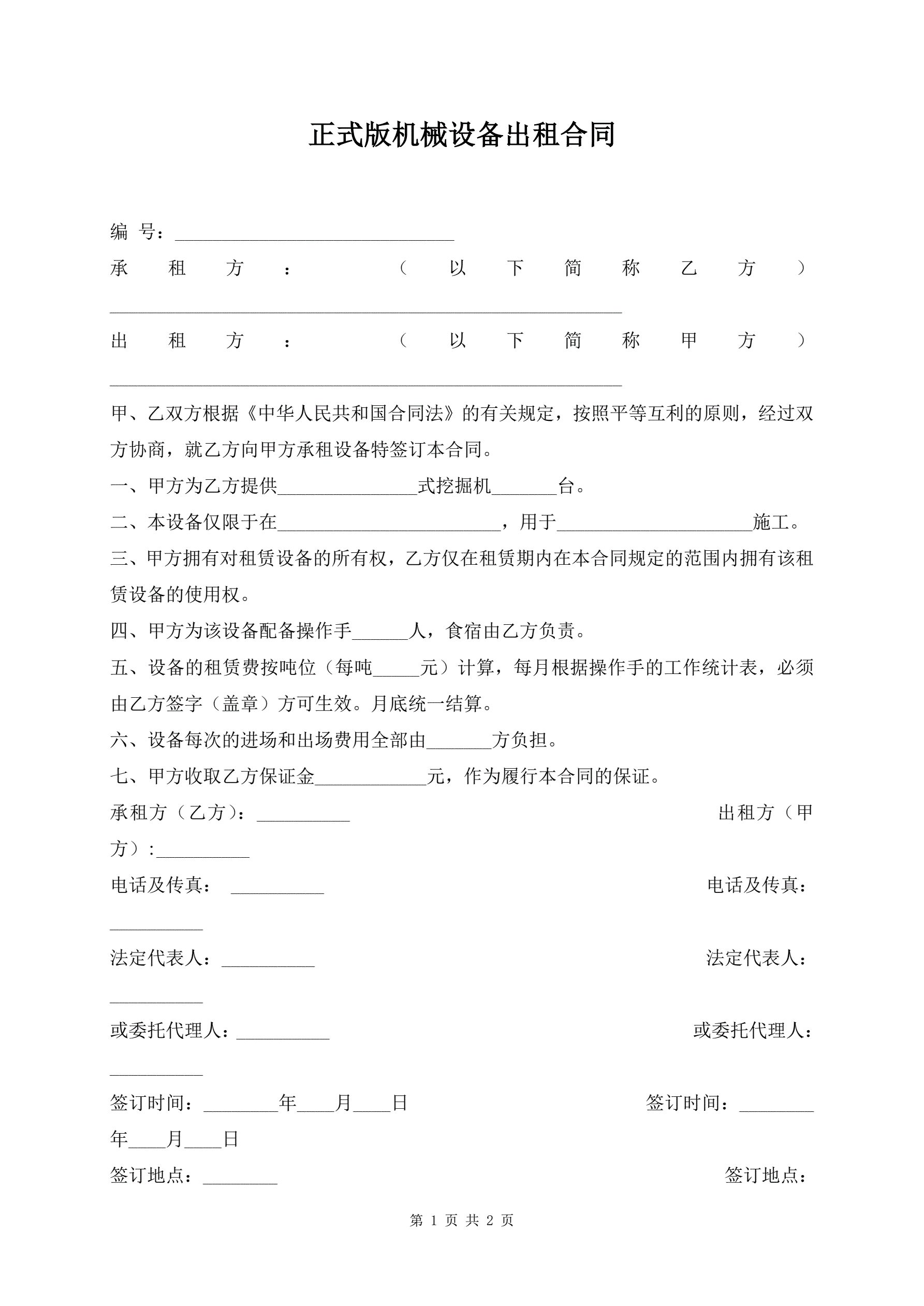 正式版机械设备出租合同