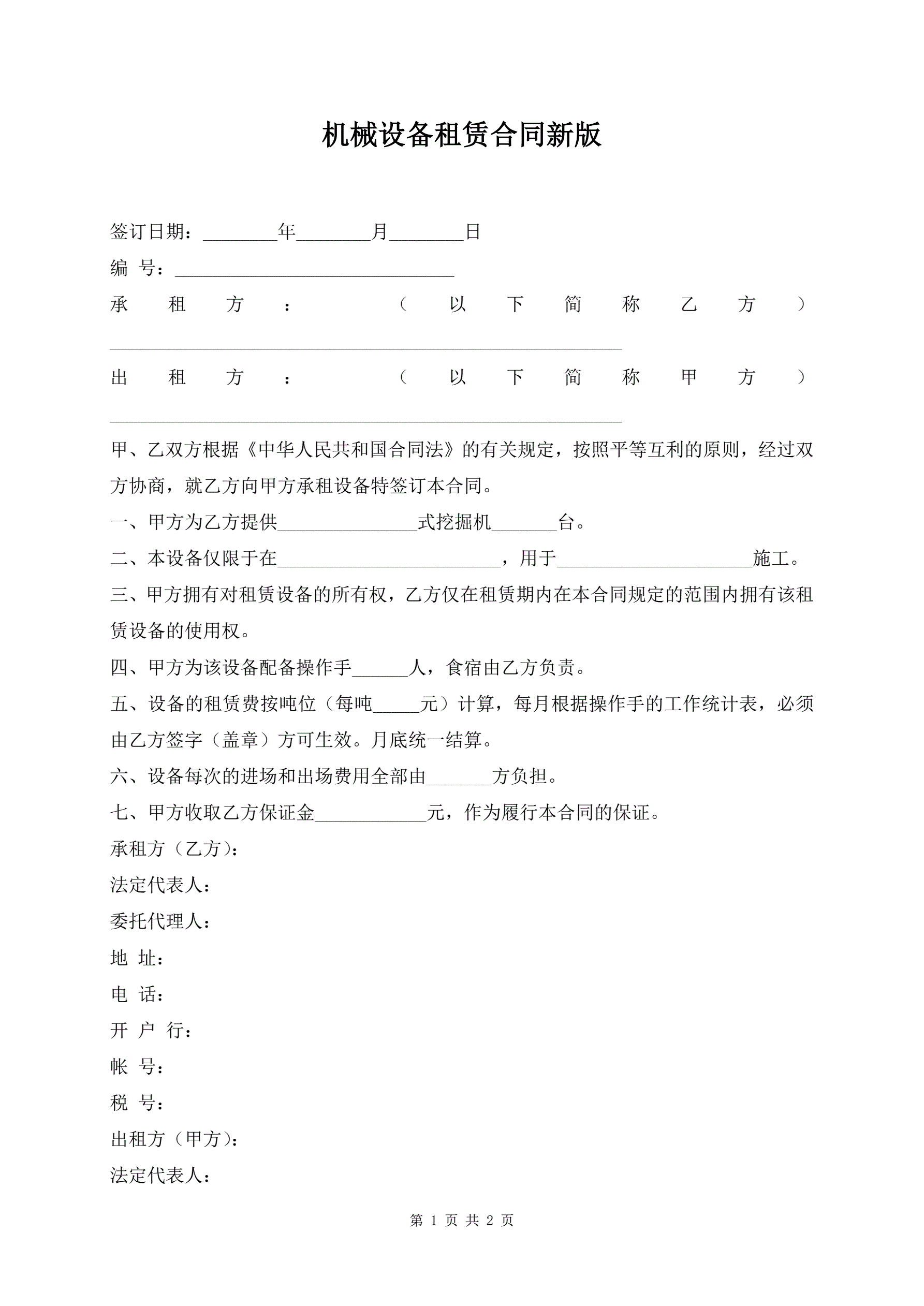 机械设备租赁合同新版