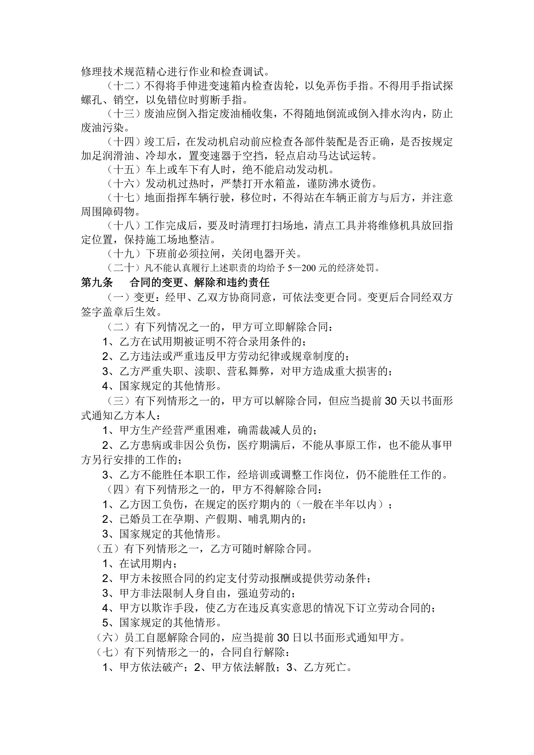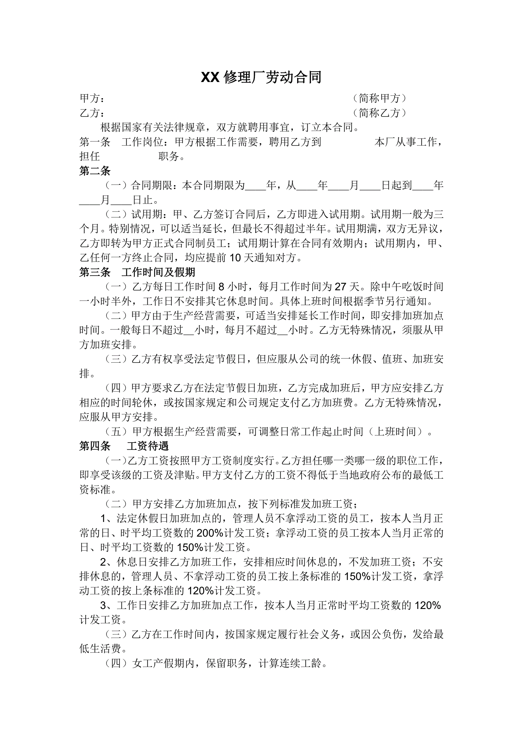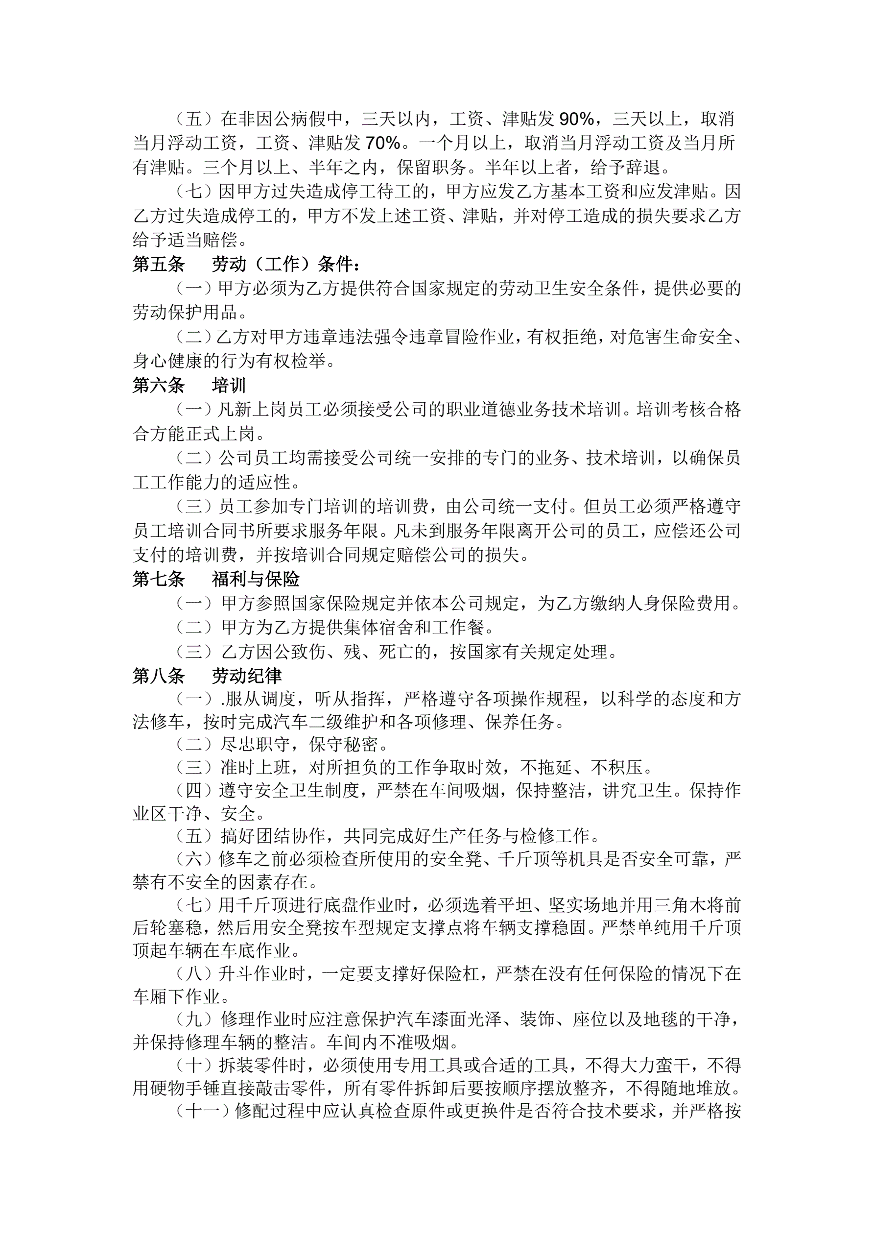 >汽车维修厂劳动合同书