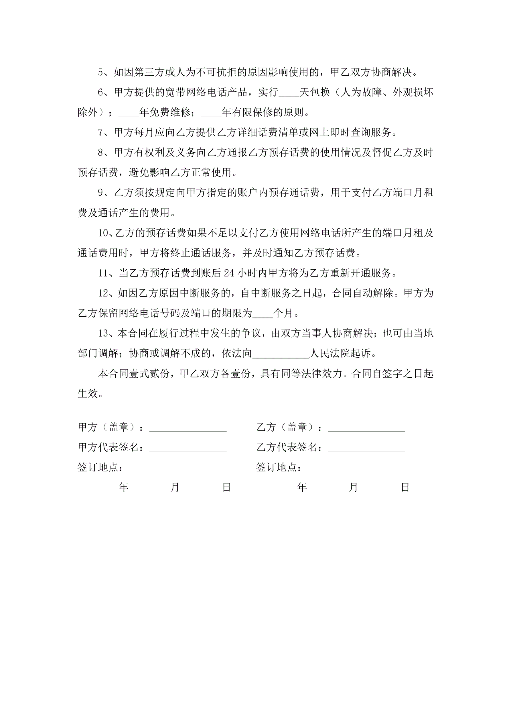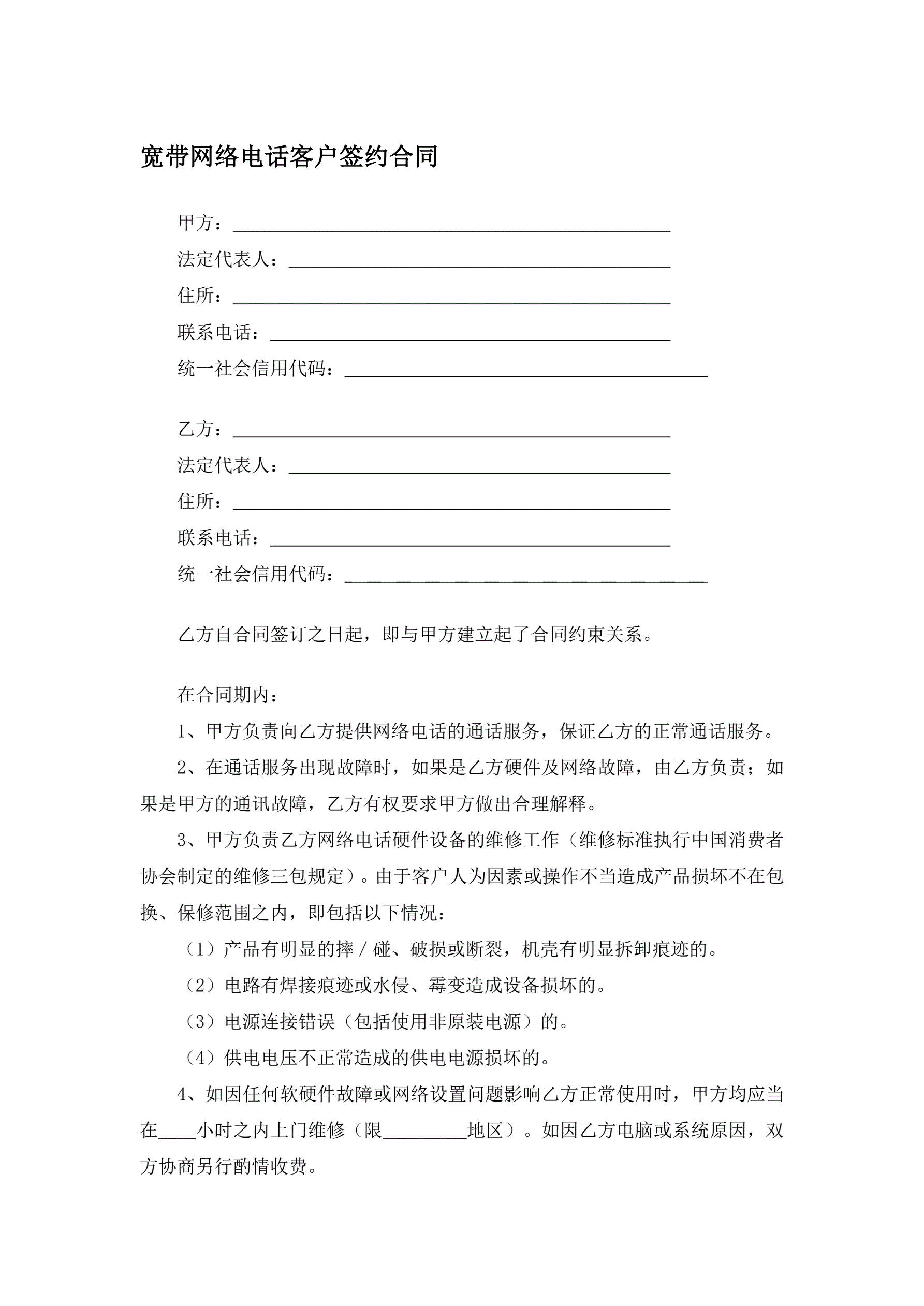 宽带网络电话客户签约合同