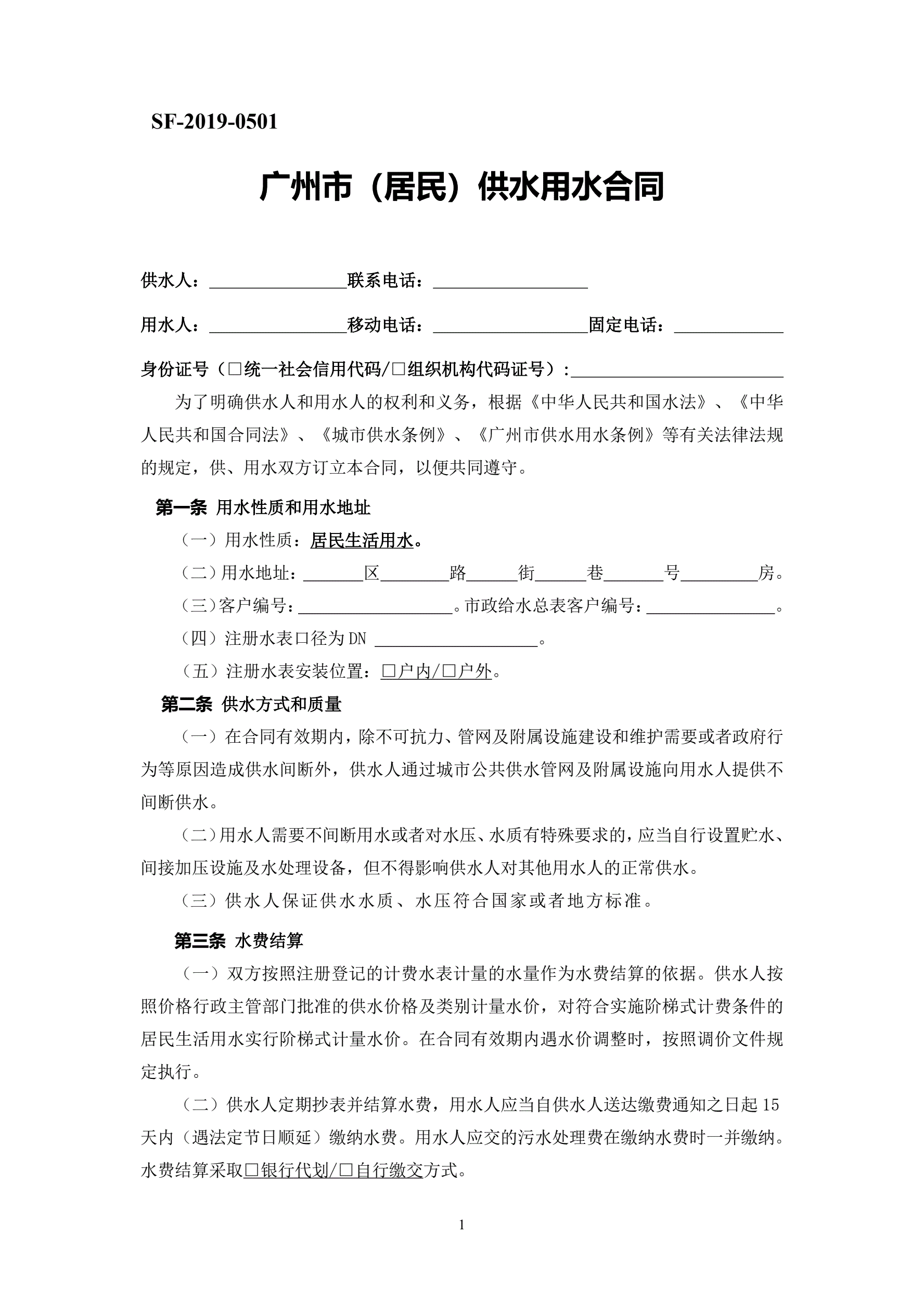 >20191211:广州市(居民)供水用水合同(SF-2019-0501)