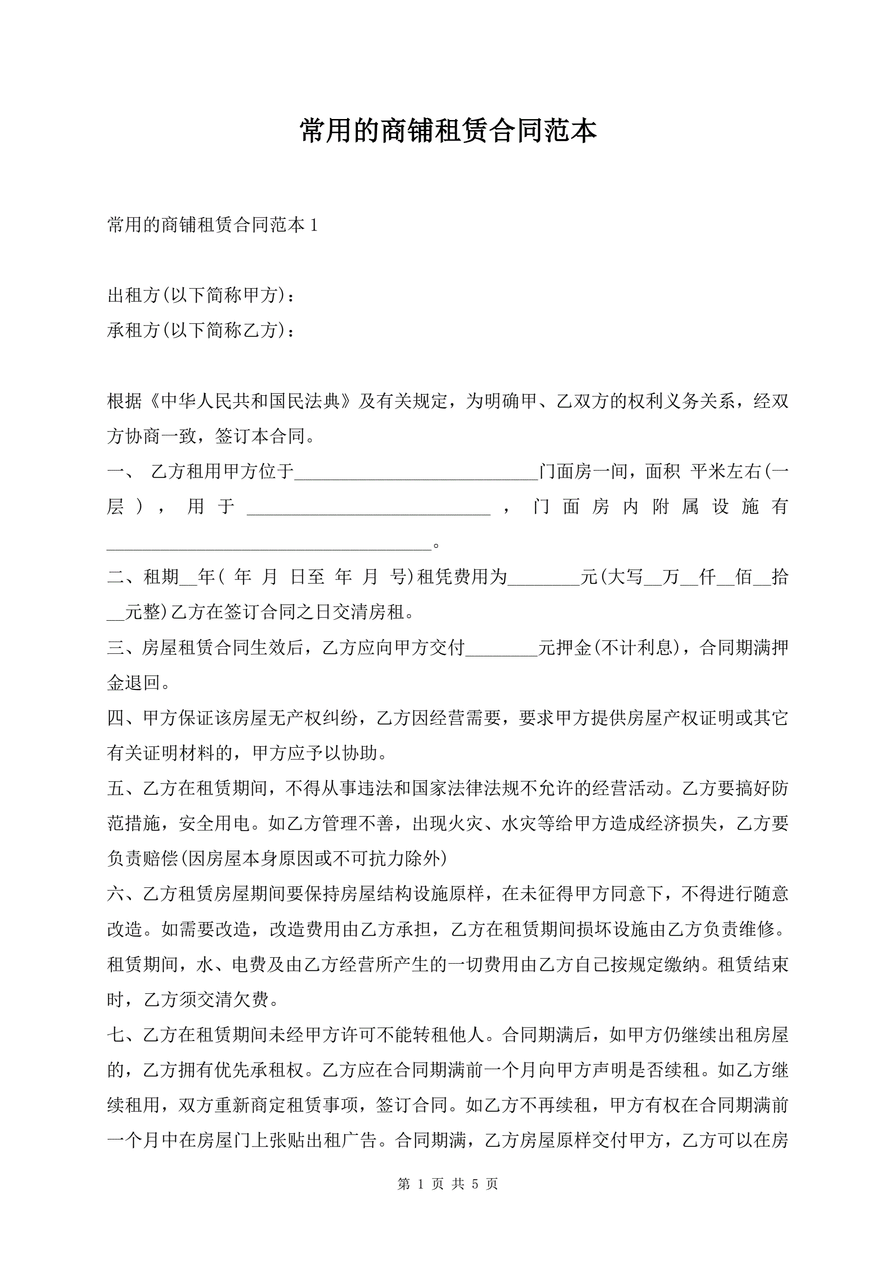 常用的商铺租赁合同范本