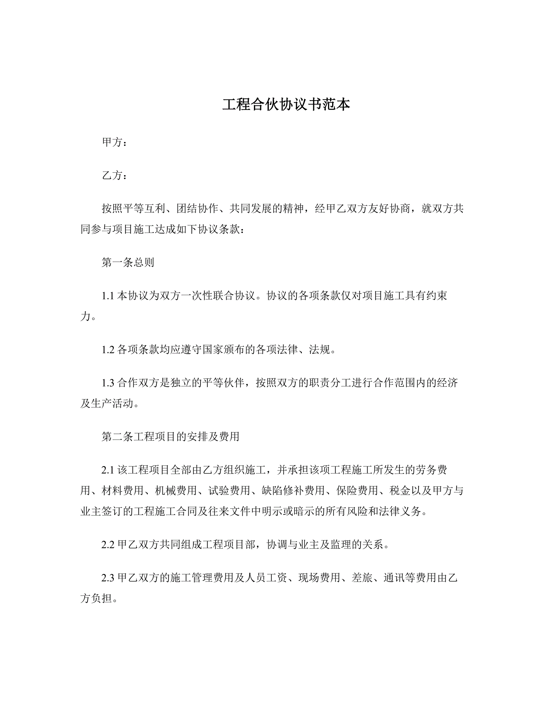 工程合伙协议书范本