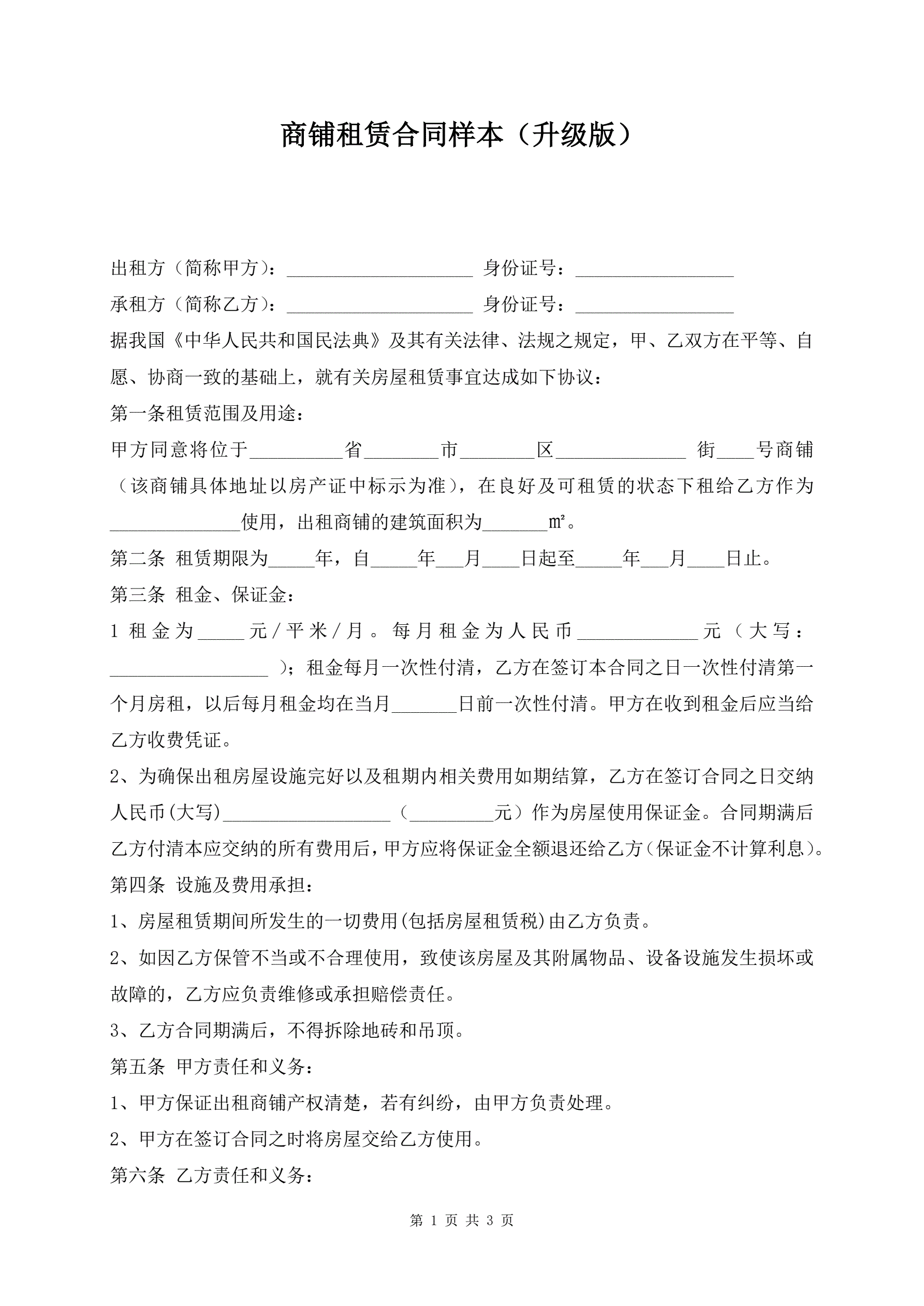 商铺租赁合同样本(升级版)