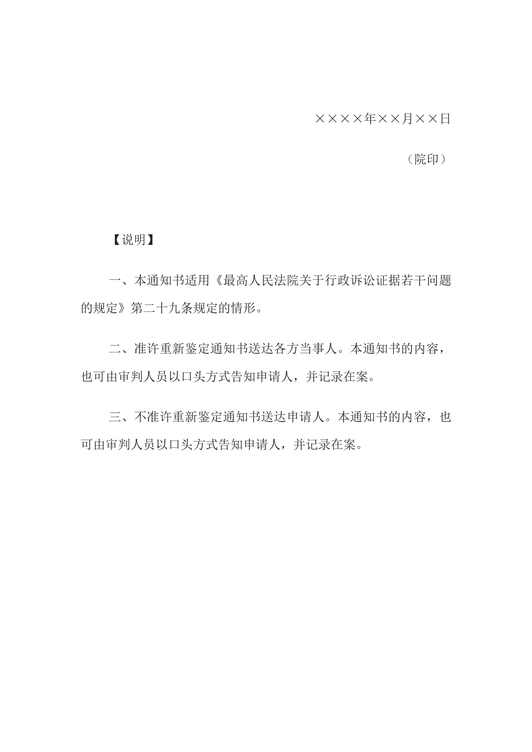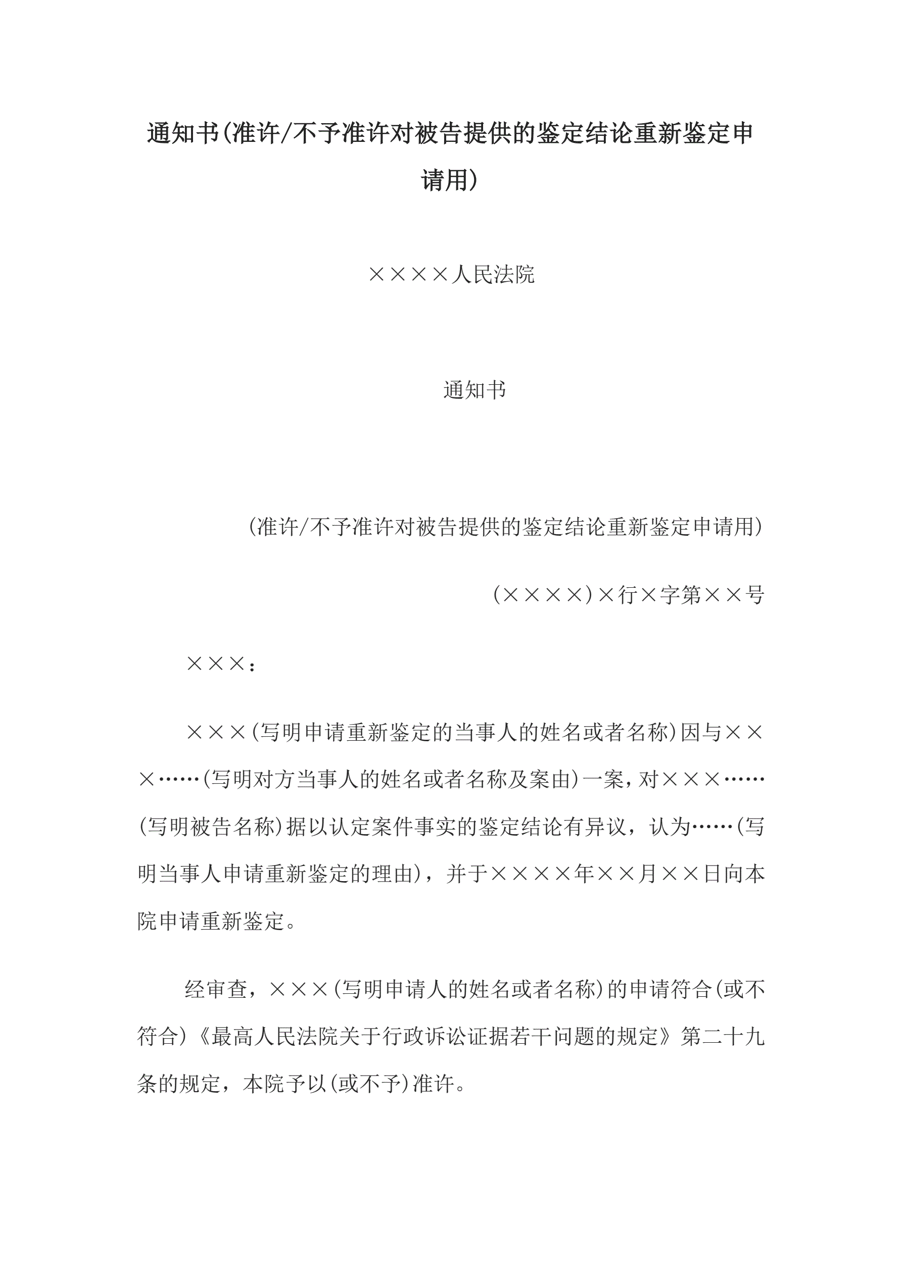 合同名称:通知书(准许或不予准许对被告提供的鉴定结论重新鉴定申请用)