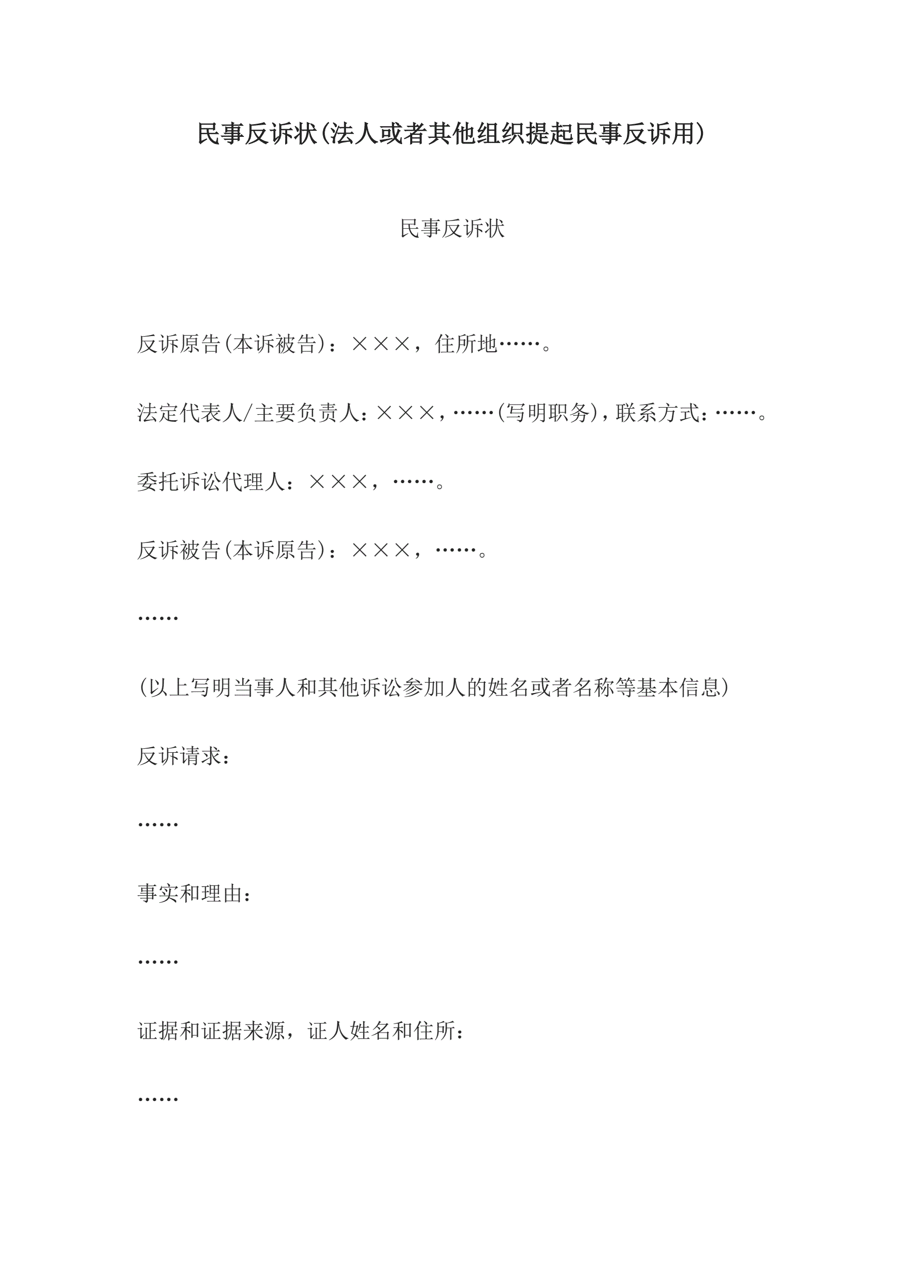 >民事反诉状(法人或者其他组织提起民事反诉用)