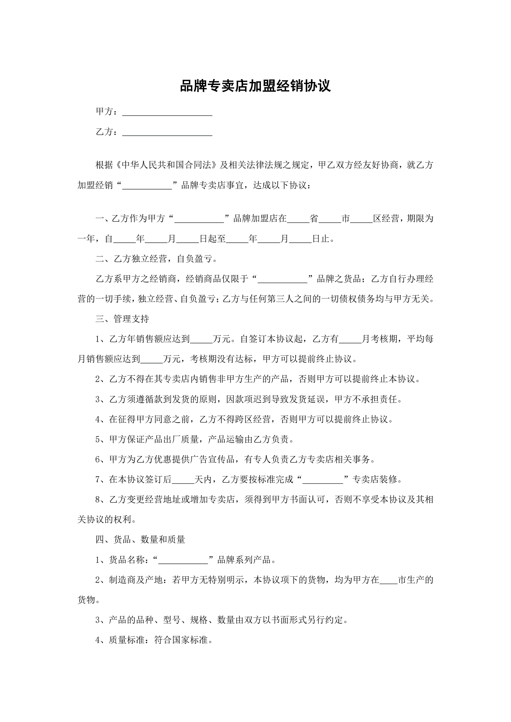 合同名称:品牌专卖店加盟经销协议