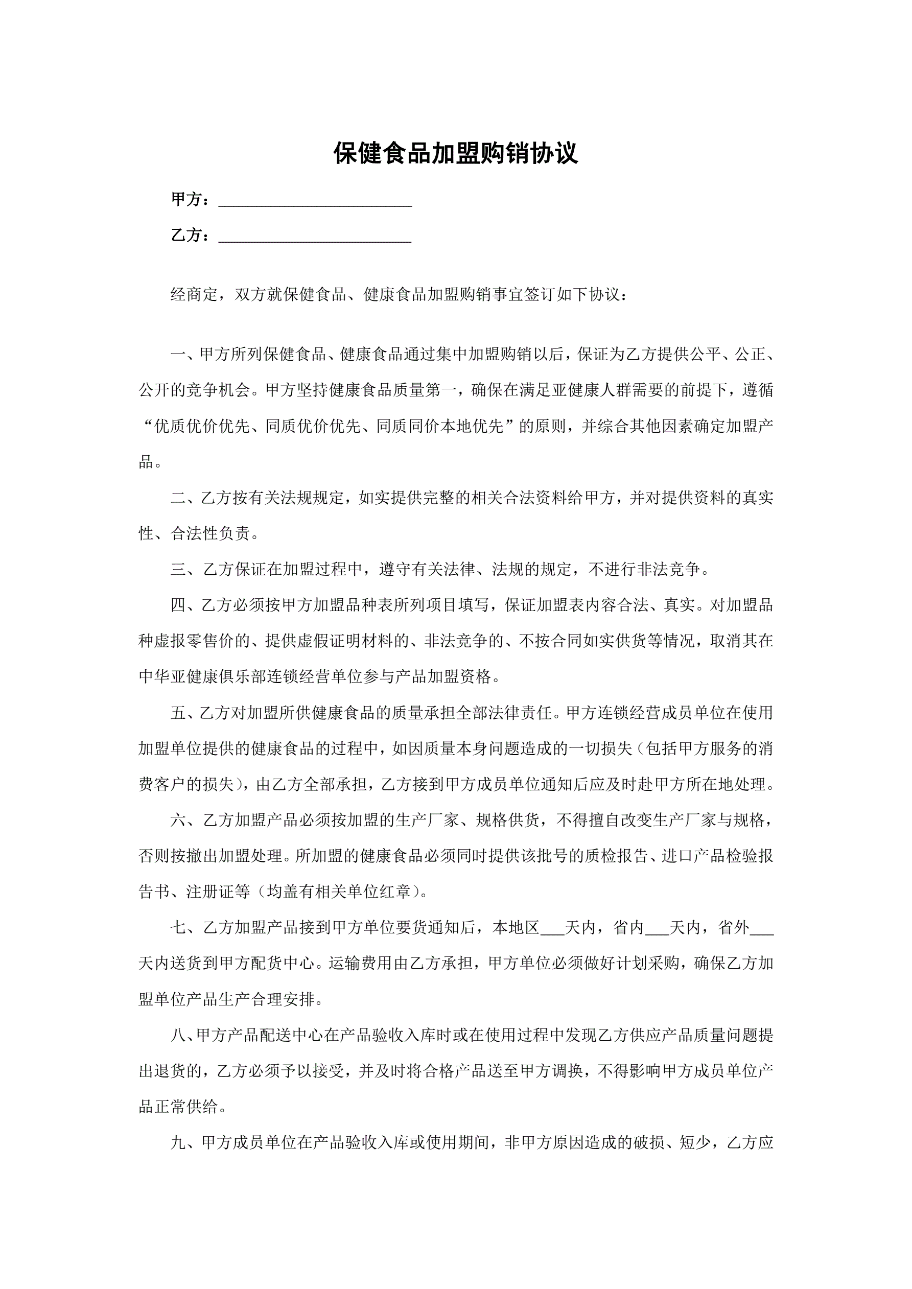 >保健食品加盟购销协议