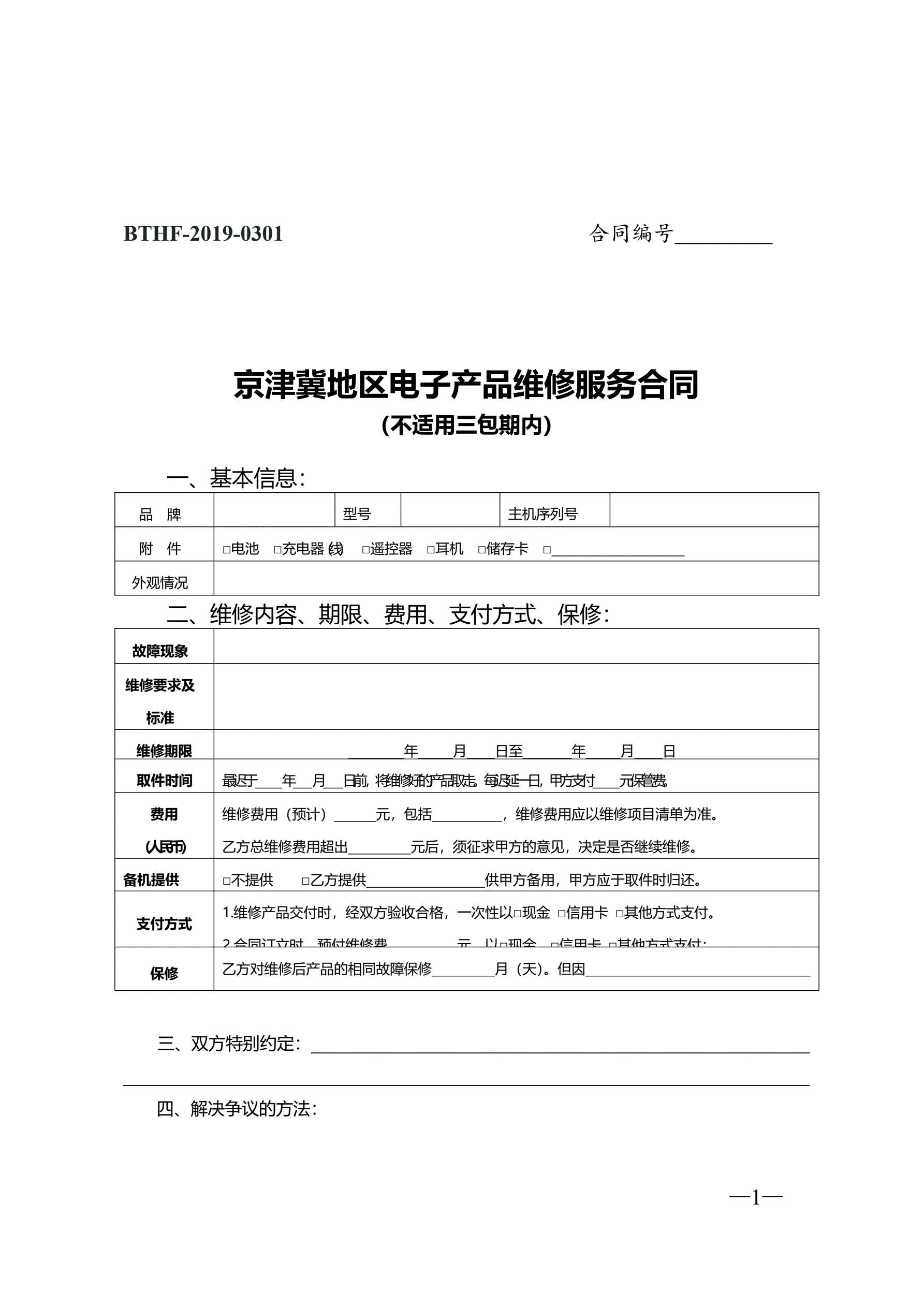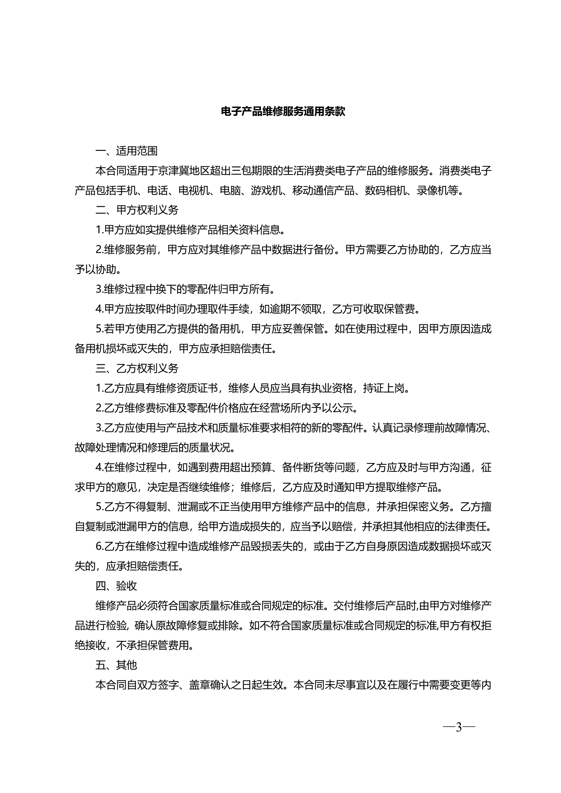 >京津冀地区电子产品维修服务合同