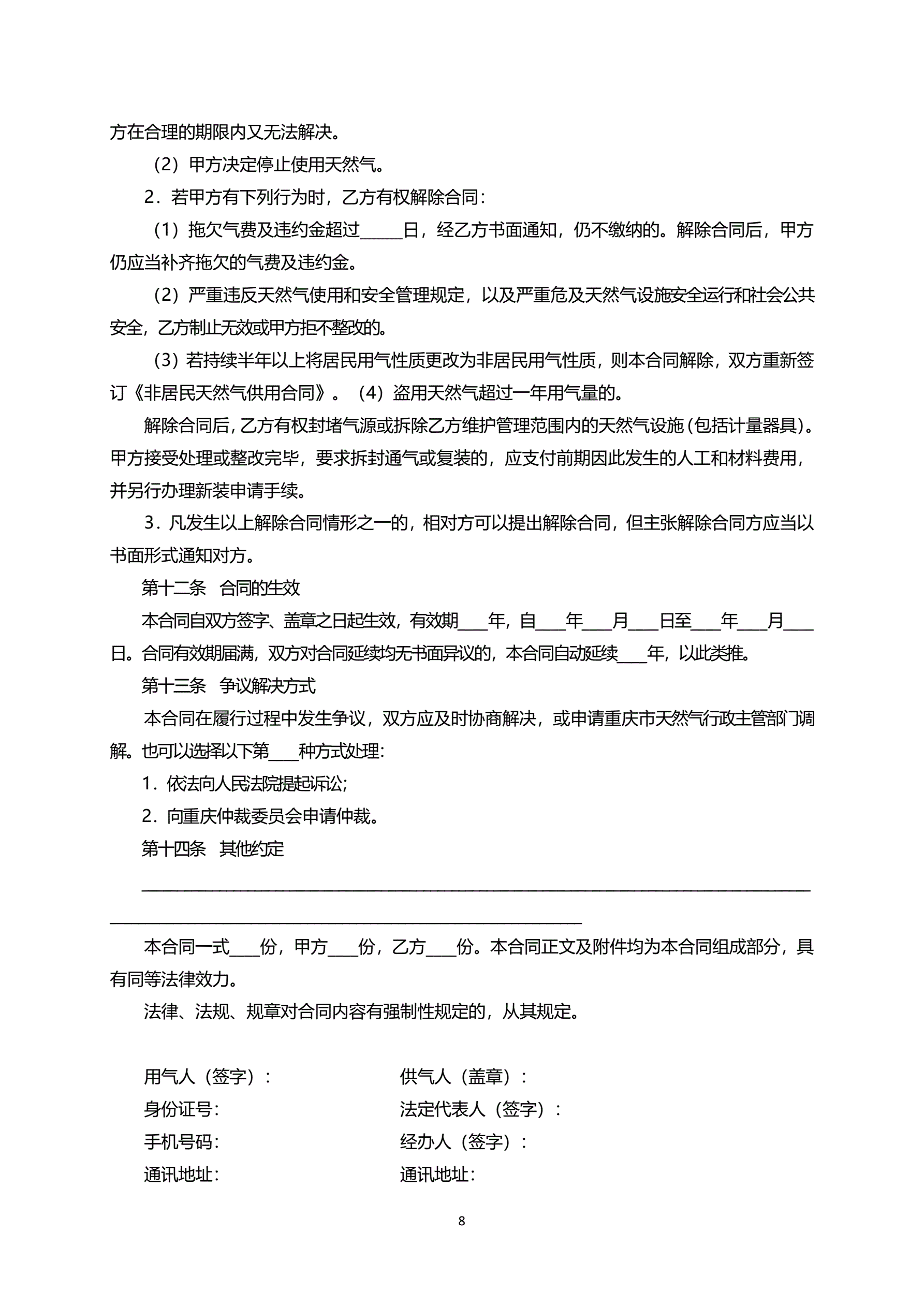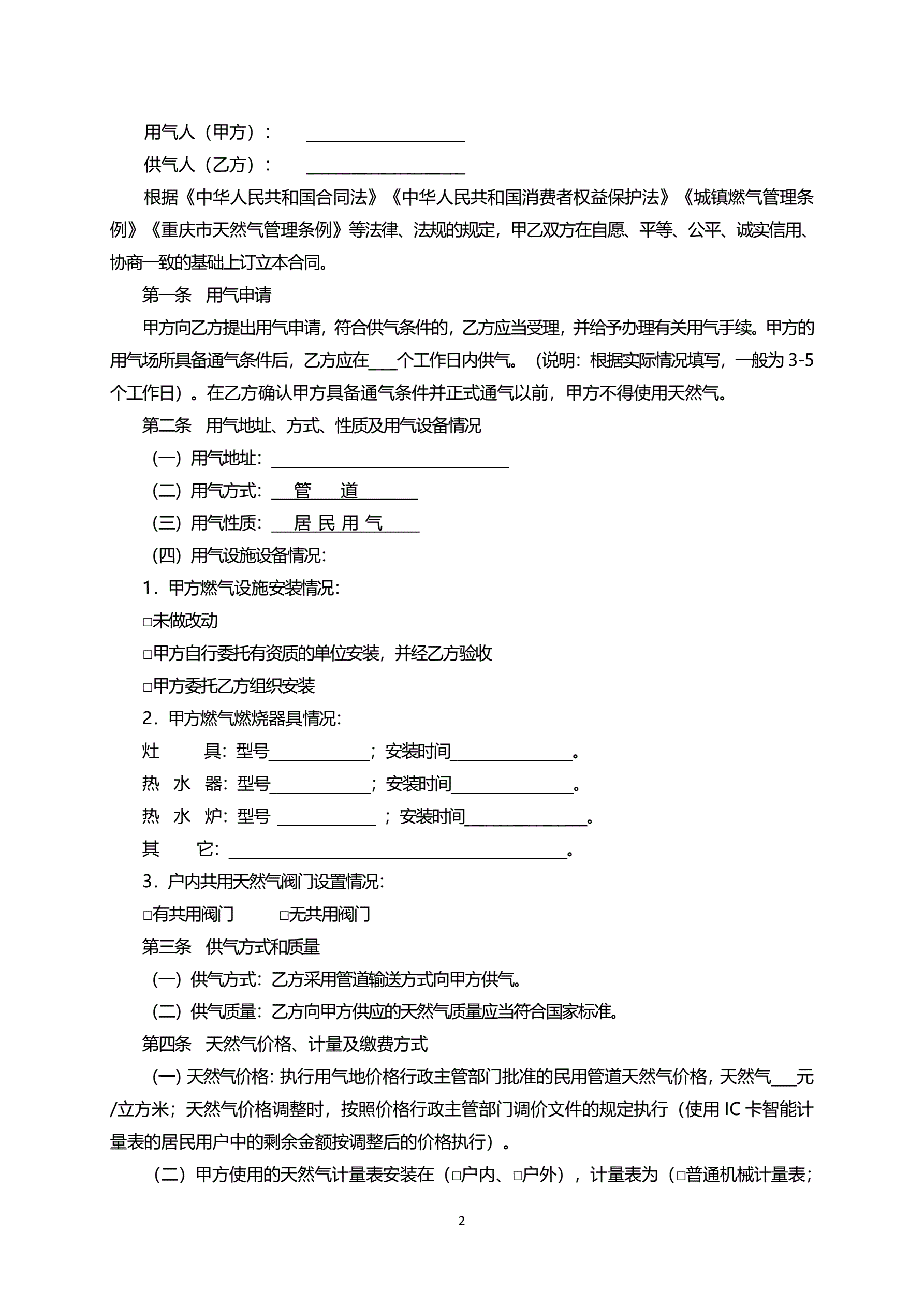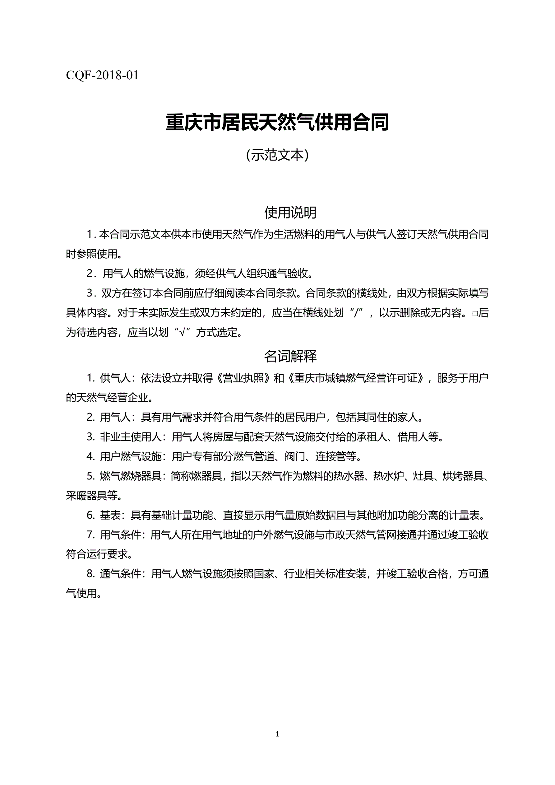 >重庆市居民天然气供用合同示范文本(2018版)