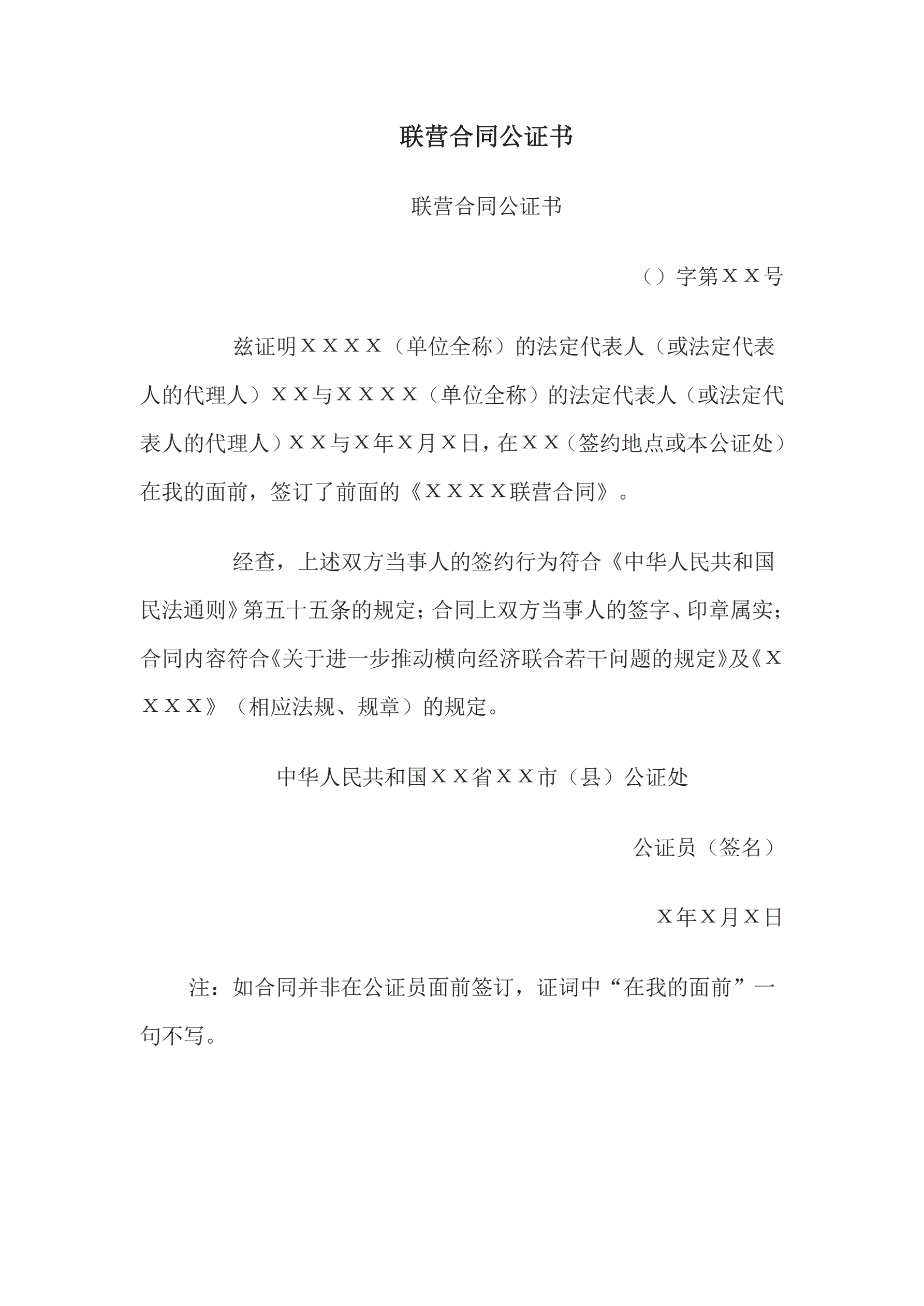 合同名称:联营合同公证书