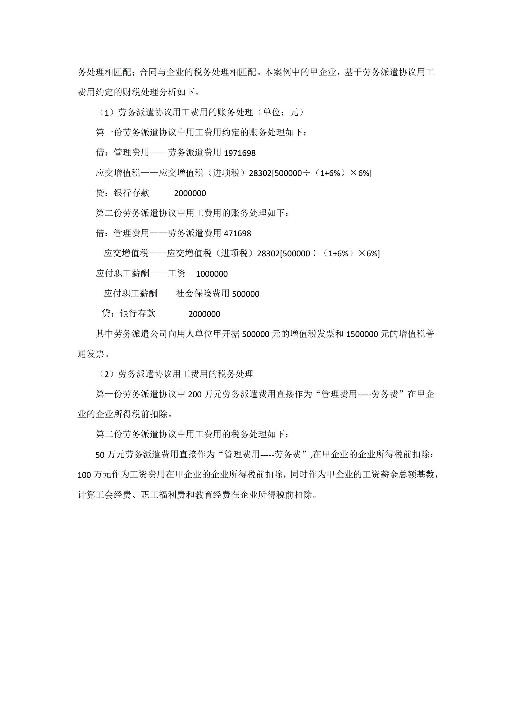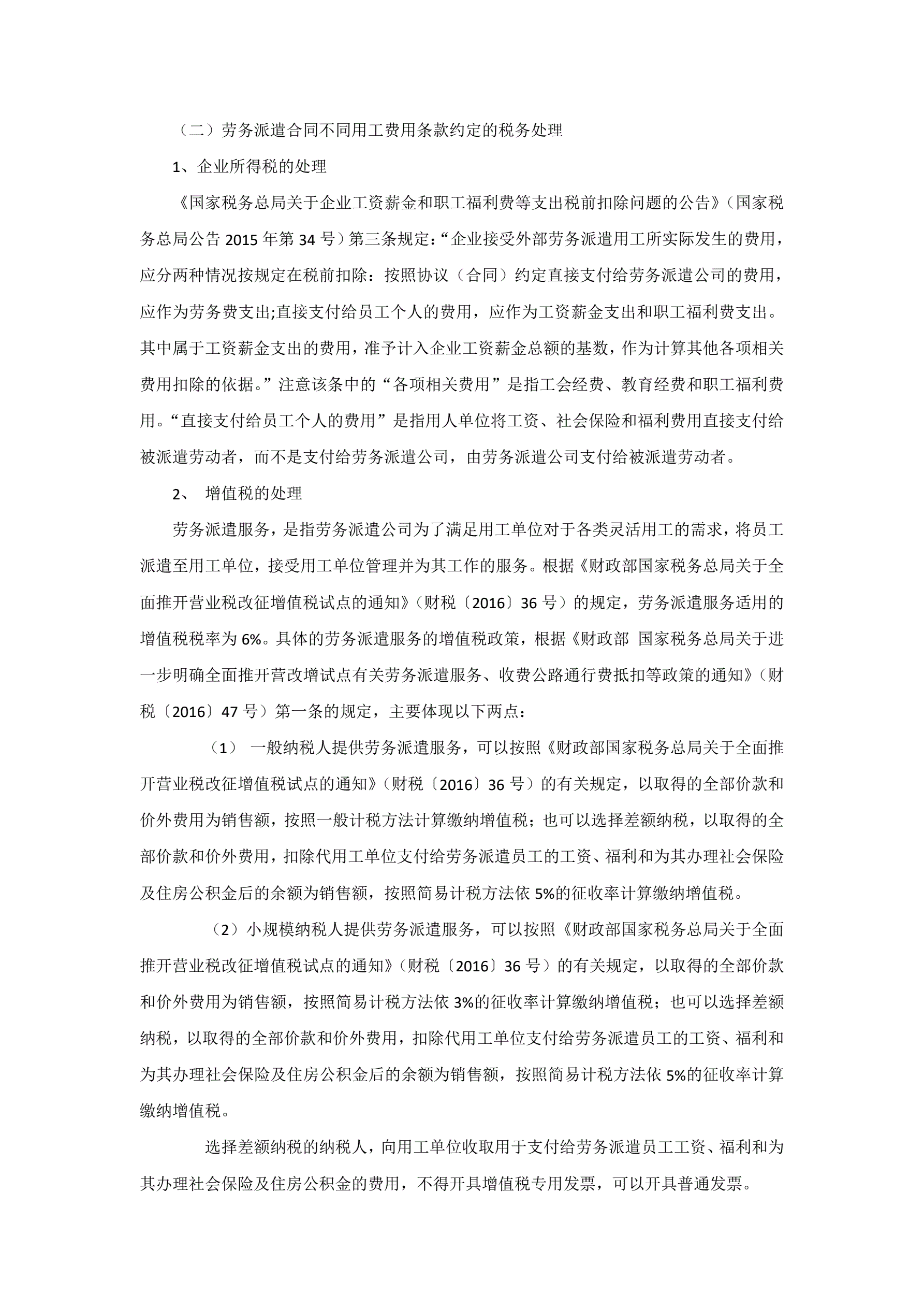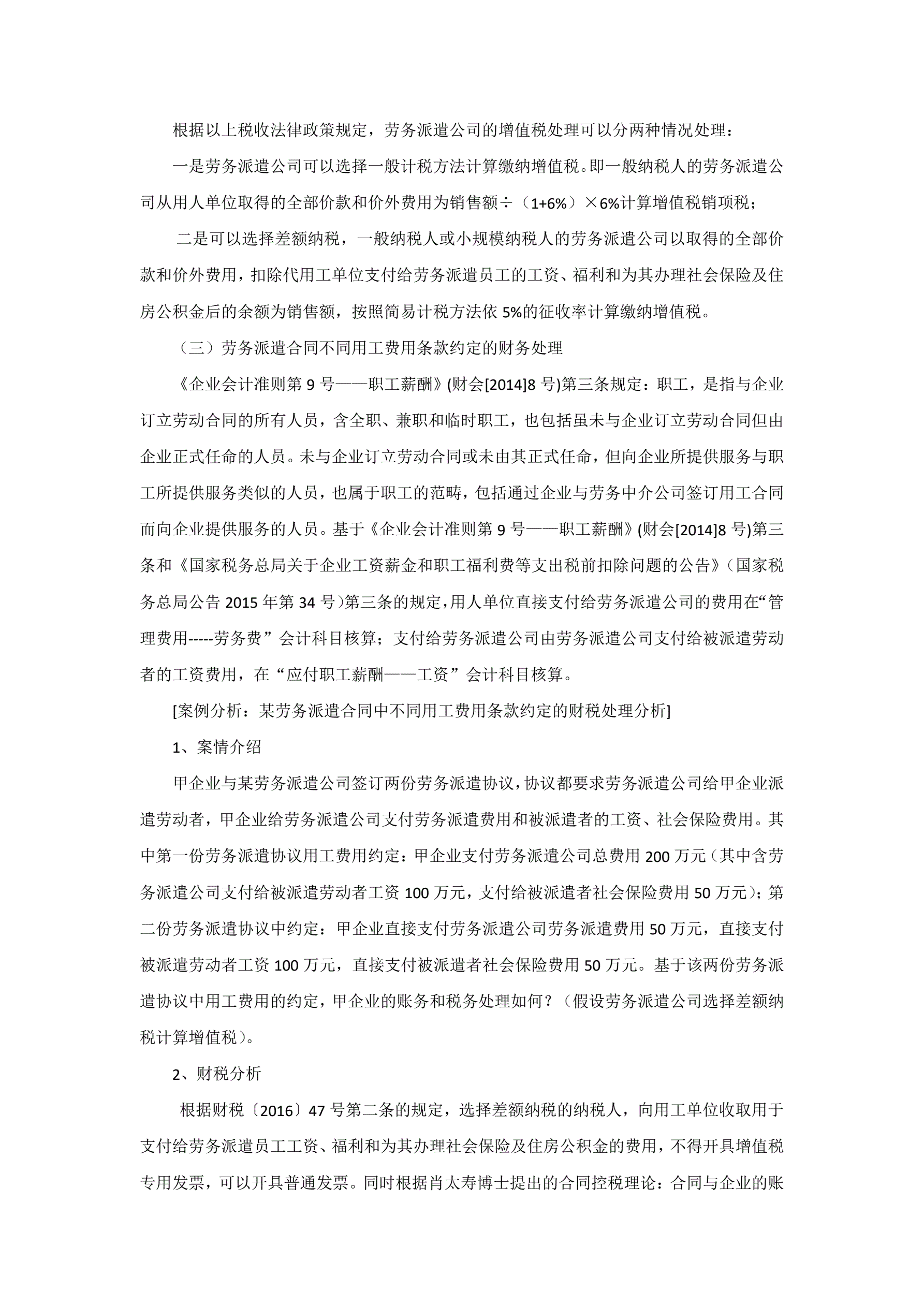 >全面营改增后劳务派遣合同中不同用工费用条款约定的财税处理