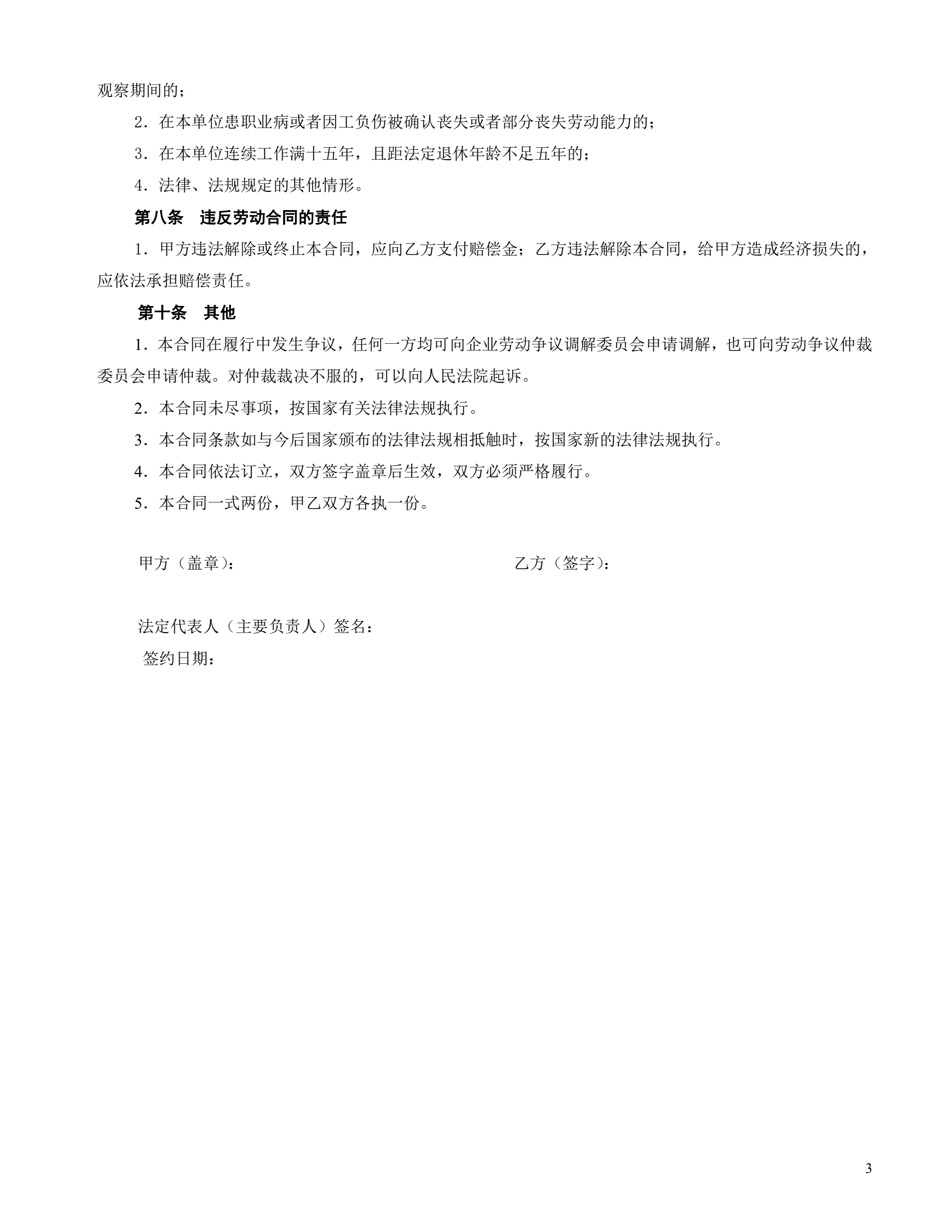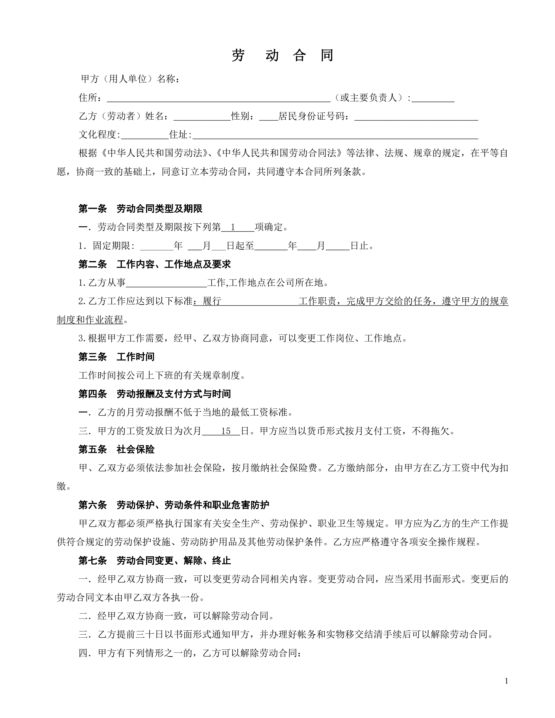 车间一般劳动合同格式