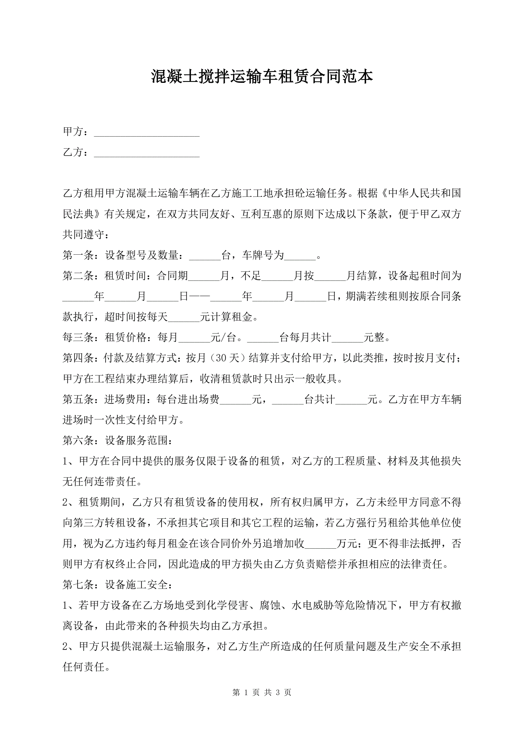 >混凝土搅拌运输车租赁合同范本