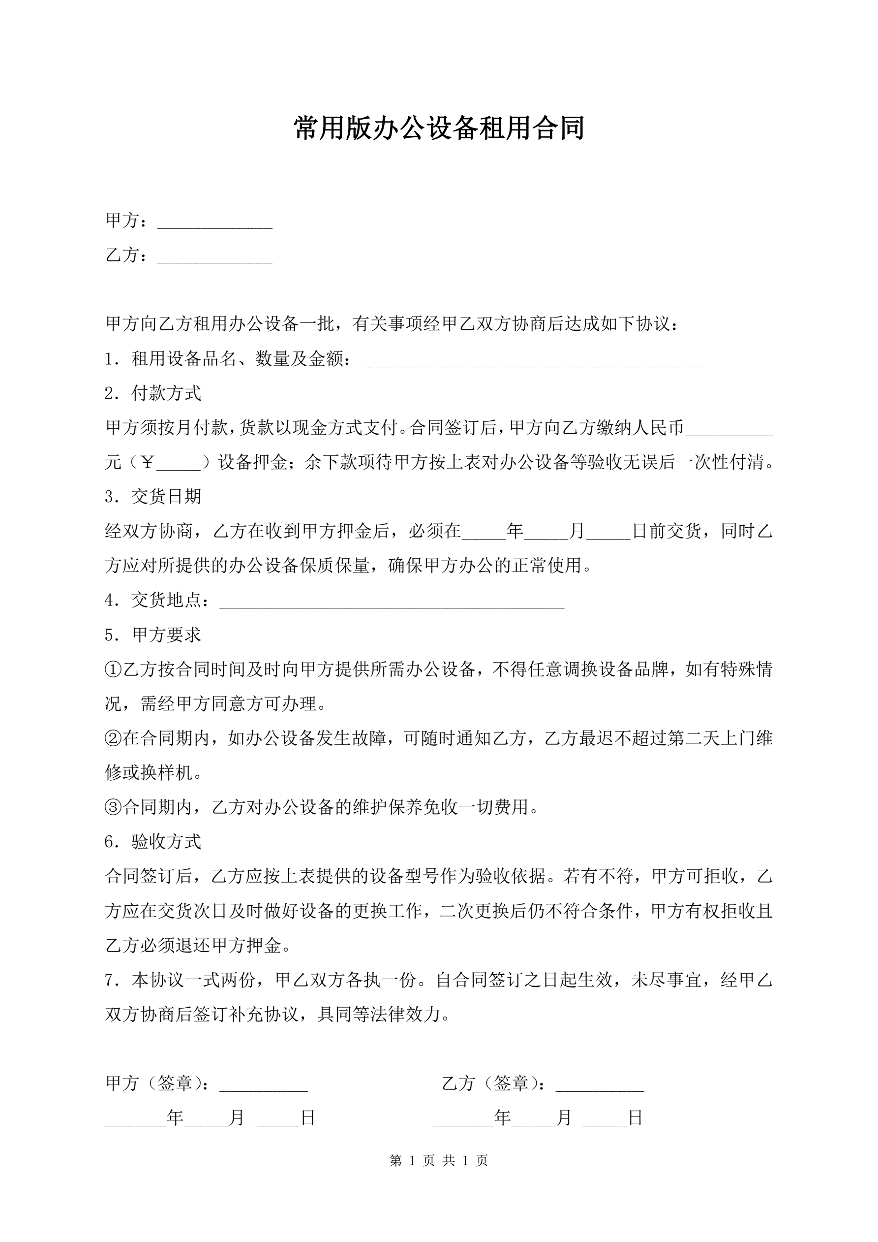 常用版办公设备租用合同
