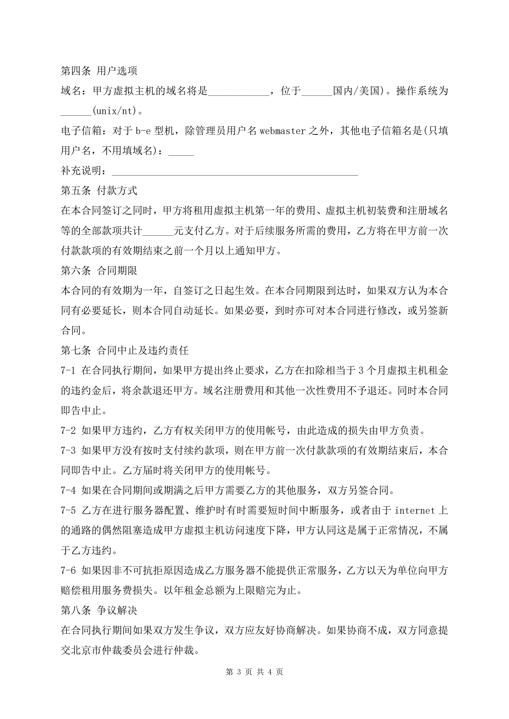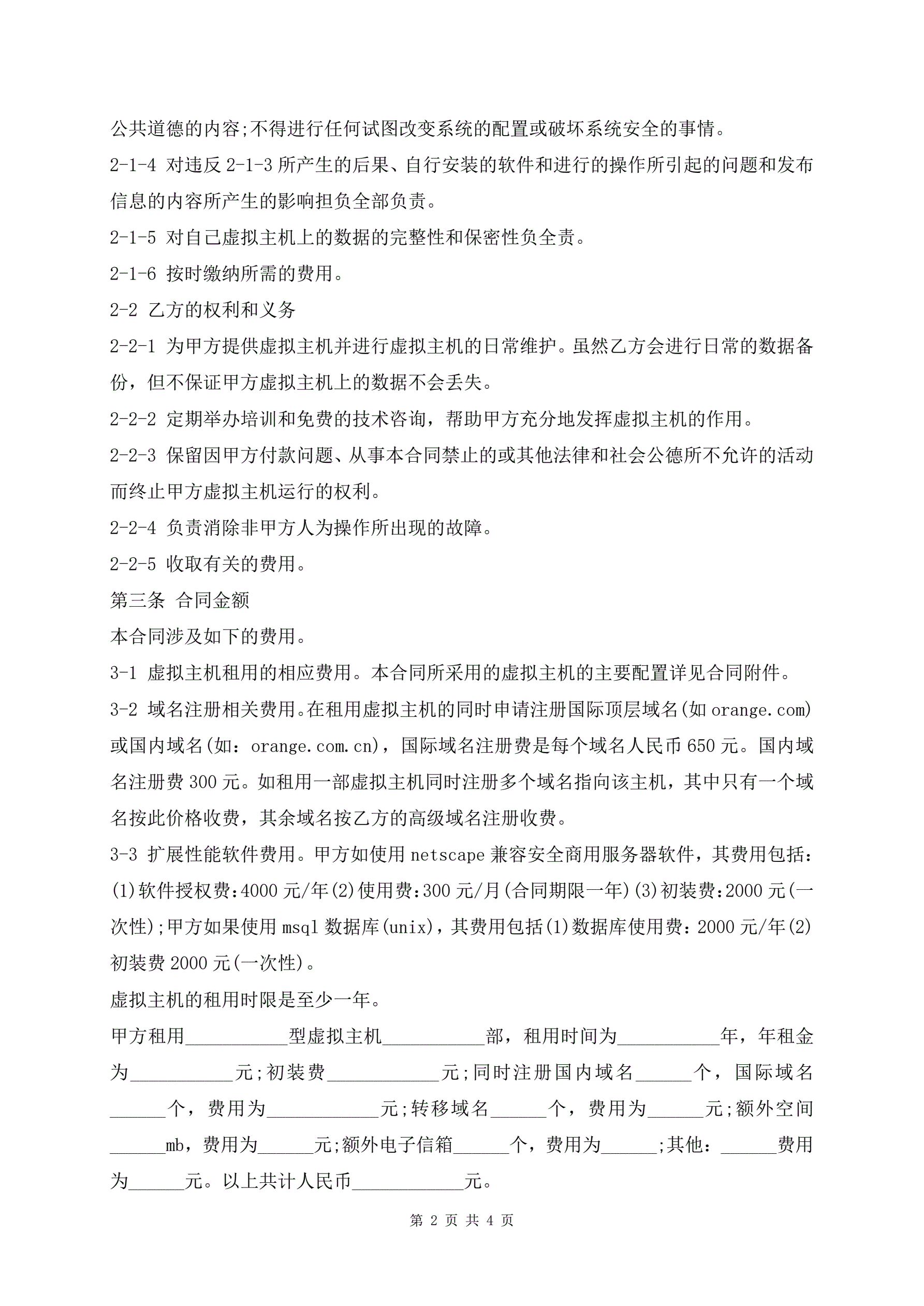 >虚拟主机租用合同书通用最新模板