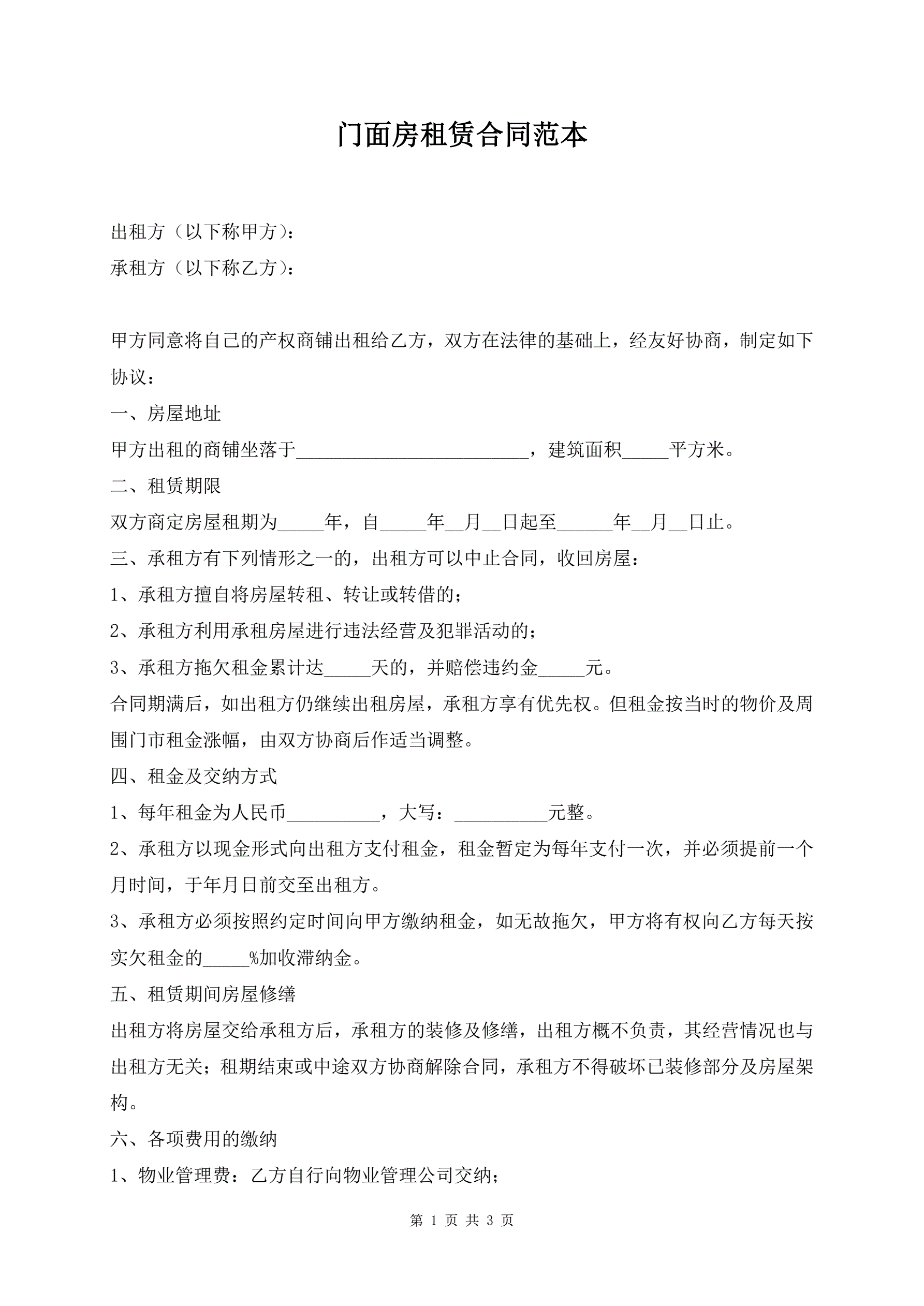 >门面房租赁合同范本