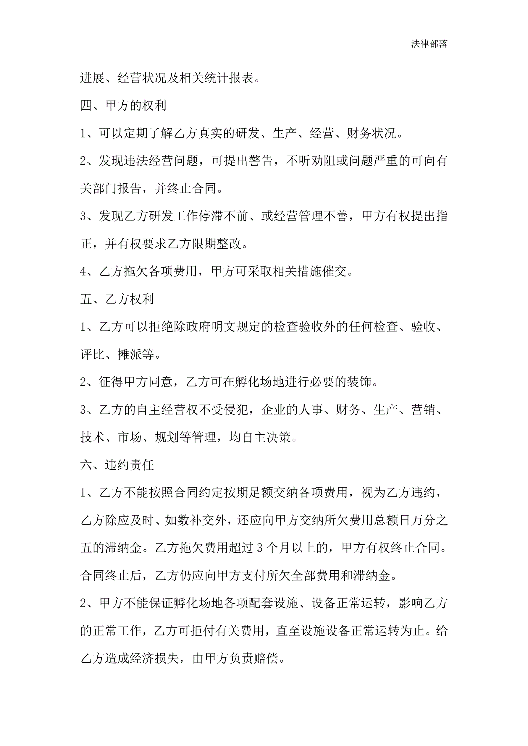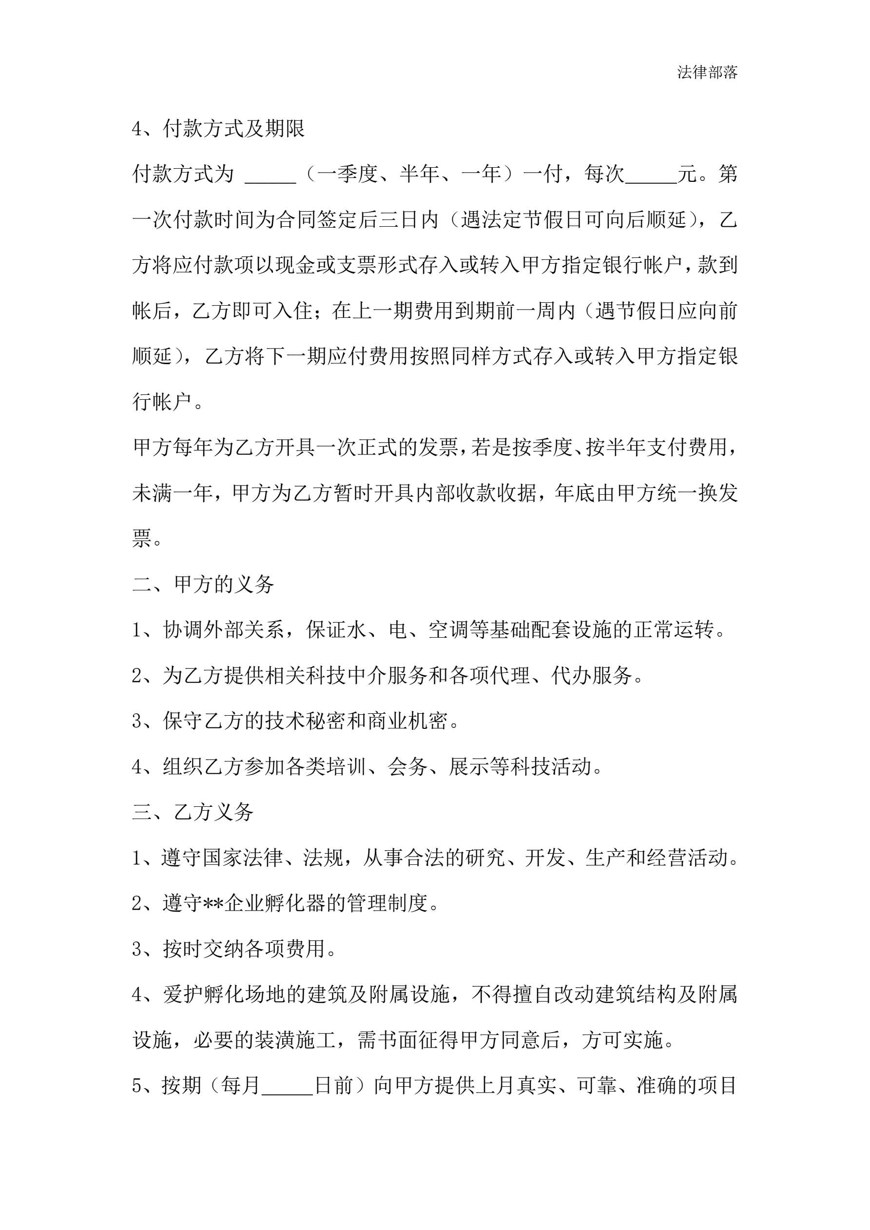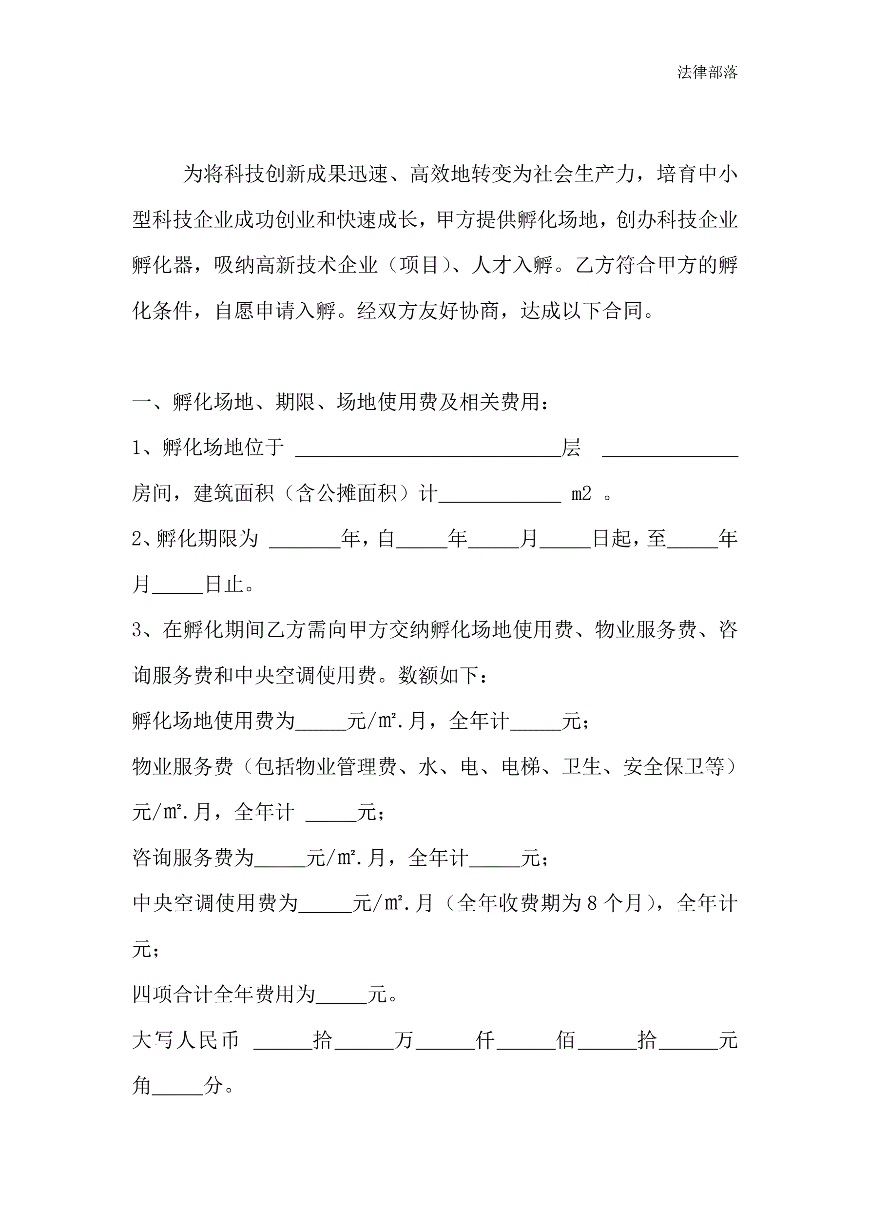 科技企业孵化器入孵合同