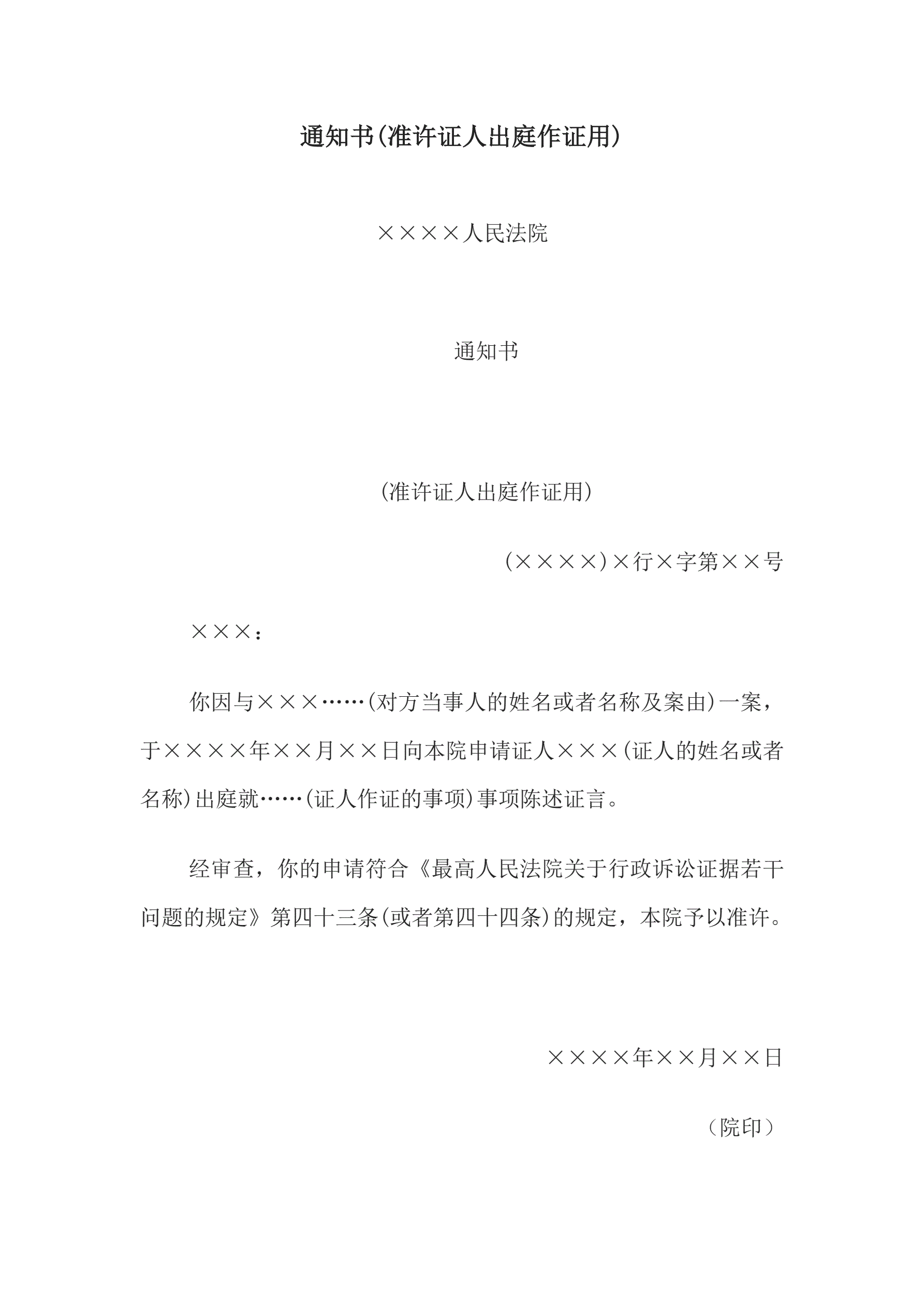 通知书(准许证人出庭作证用)