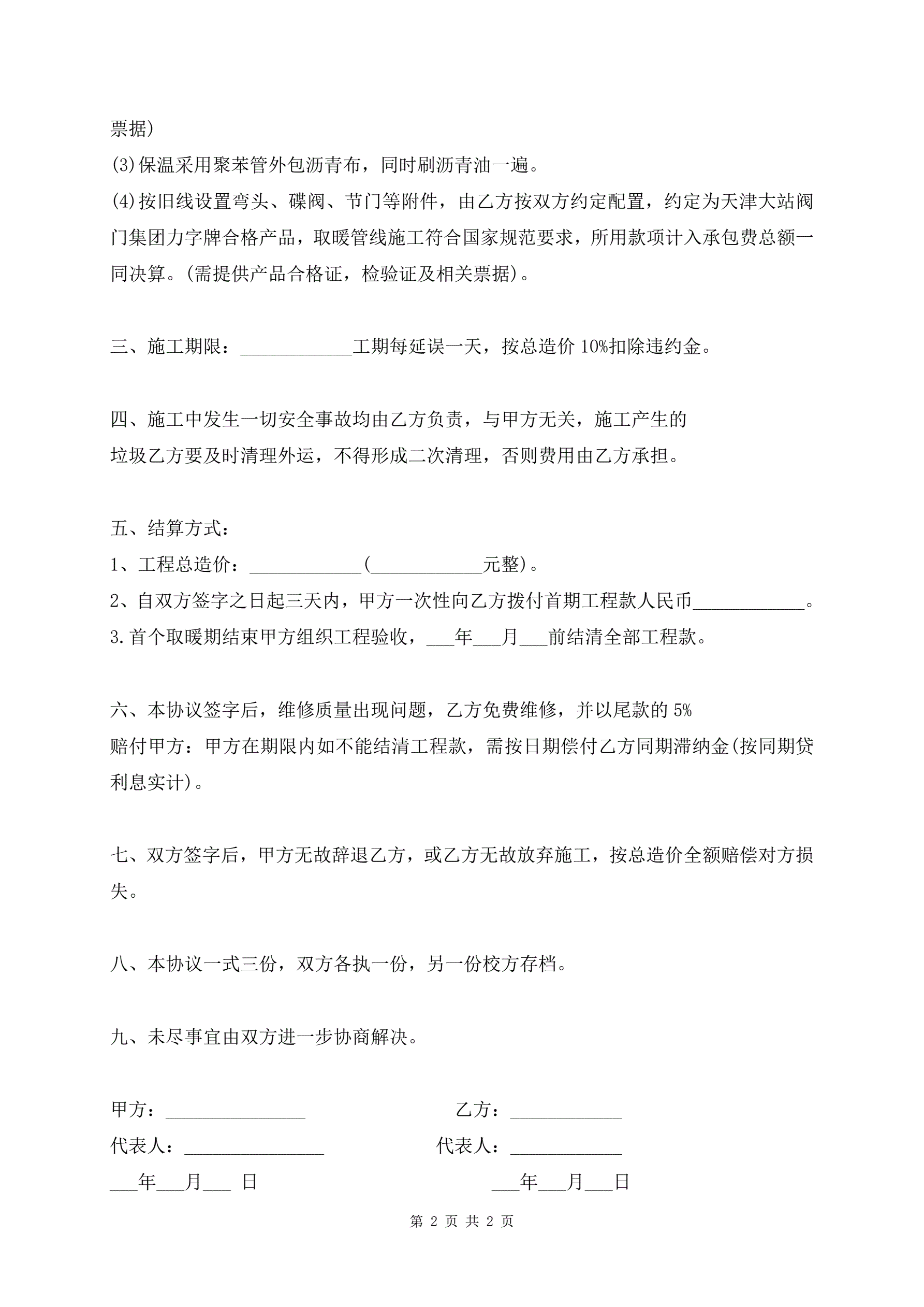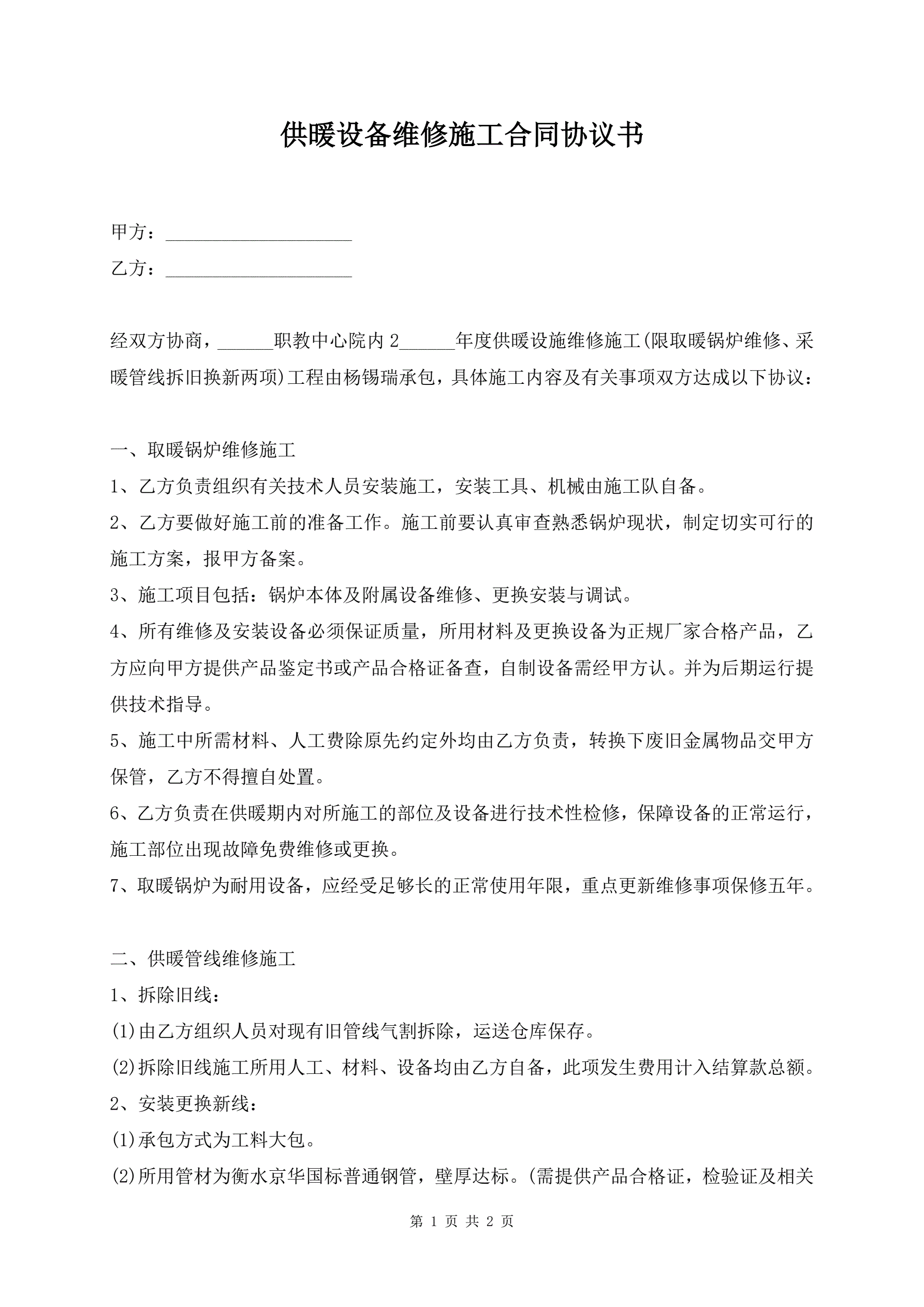 >供暖设备维修施工合同协议书
