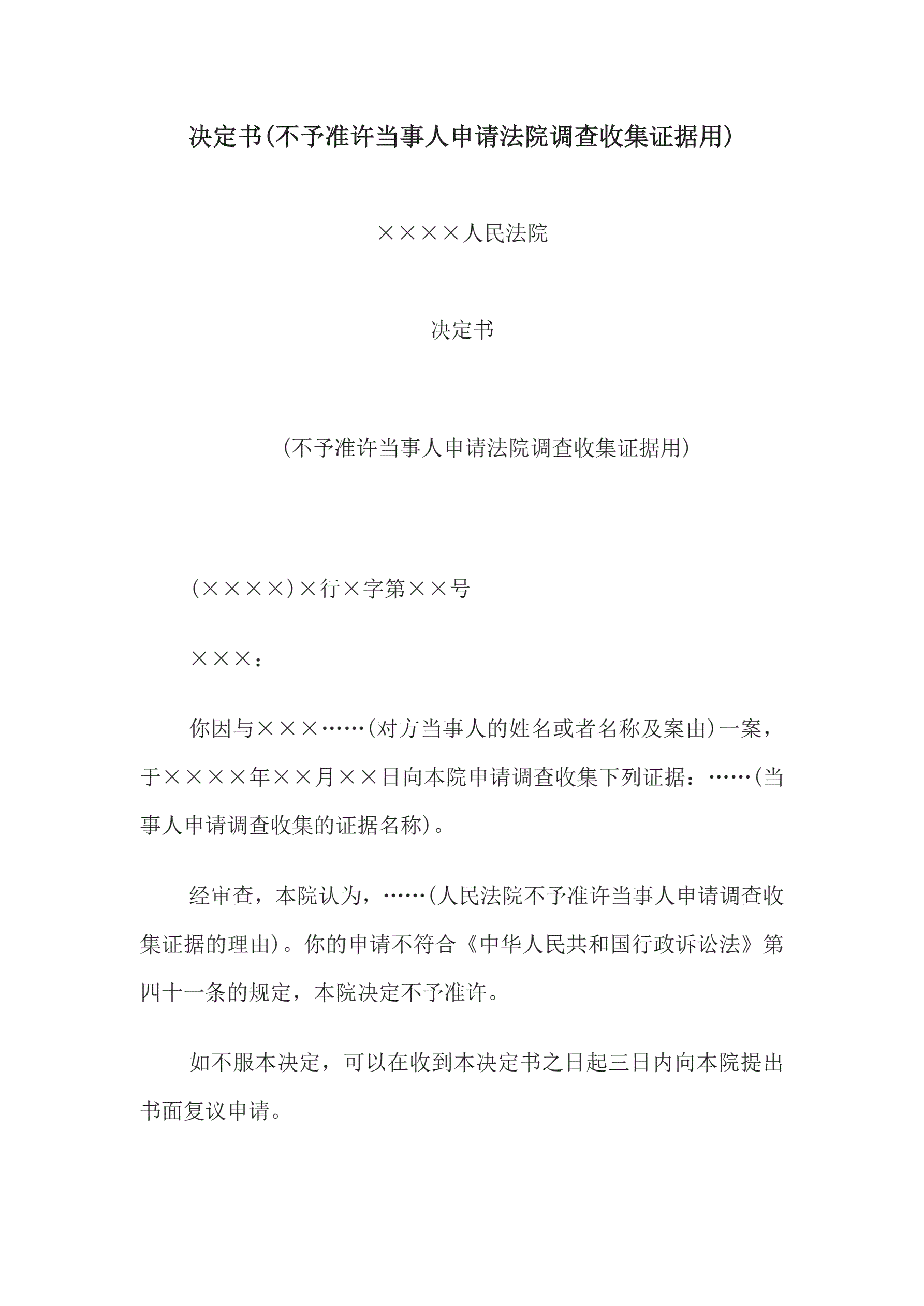 >决定书(不予准许当事人申请法院调查收集证据用)