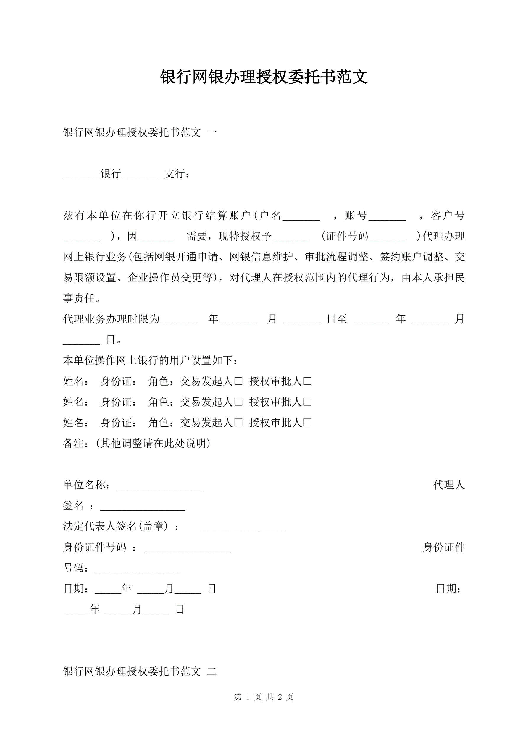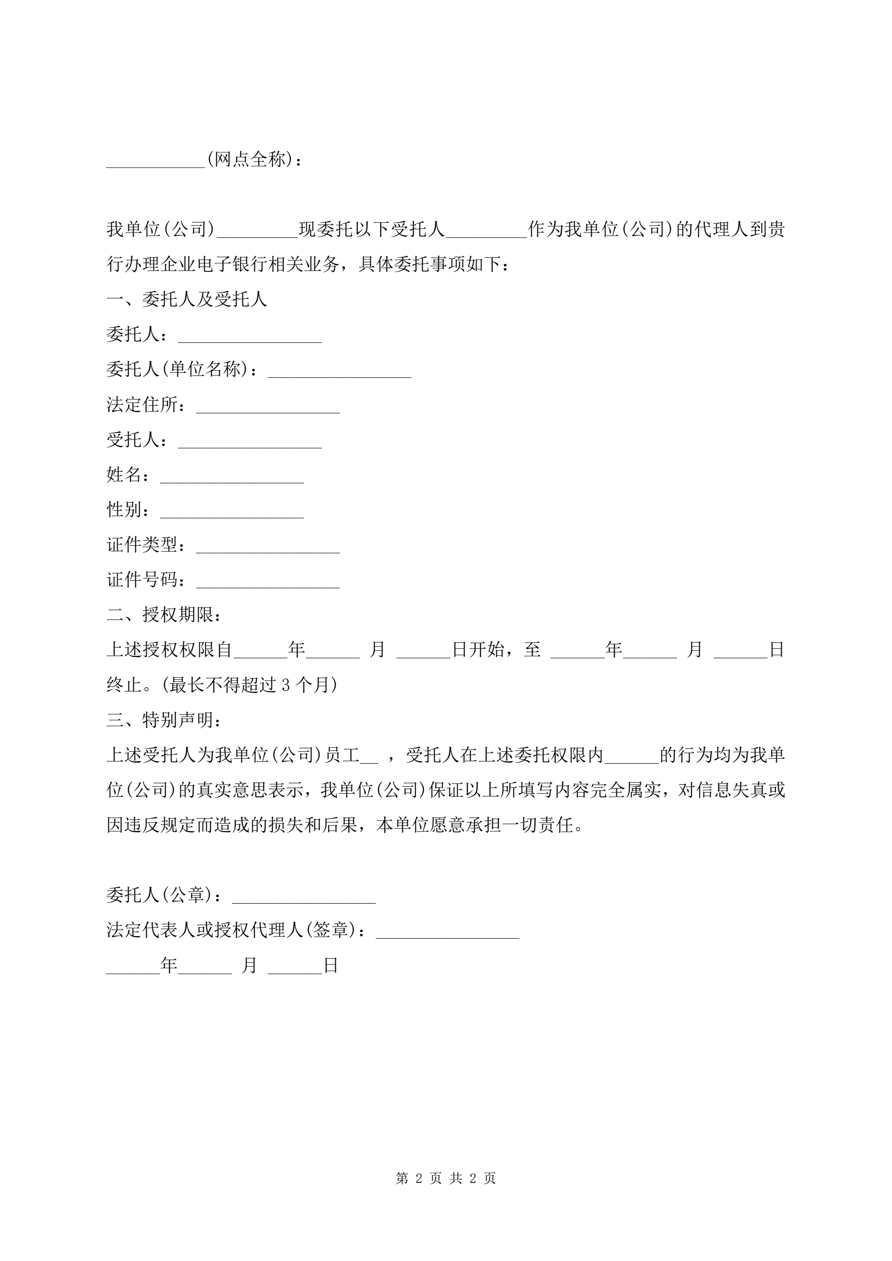 银行网银办理授权委托书范文