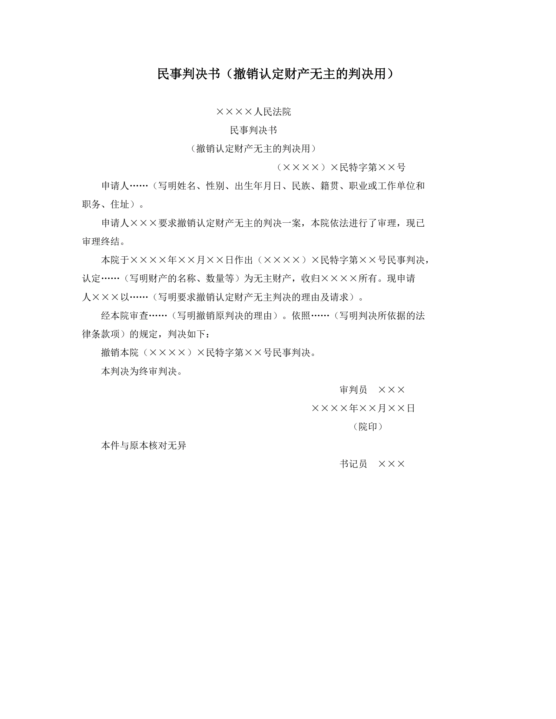 >民事判决书(撤销认定财产无主的判决用)