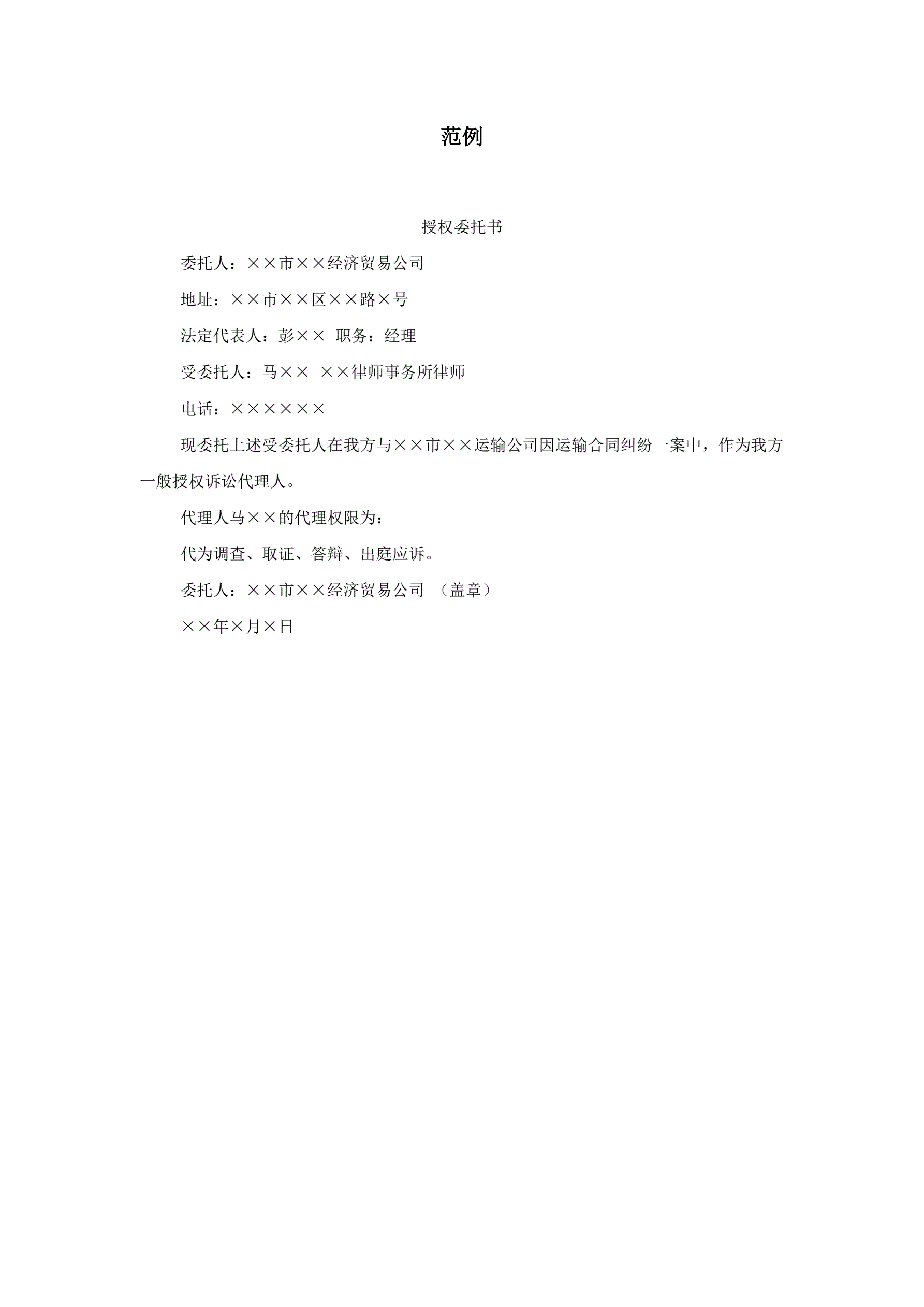 民事诉讼代理授权委托书范例