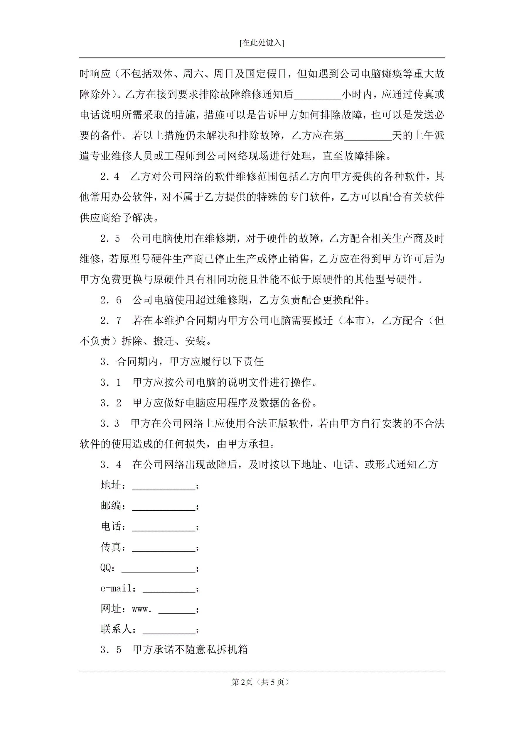 办公室电脑系统维护合同