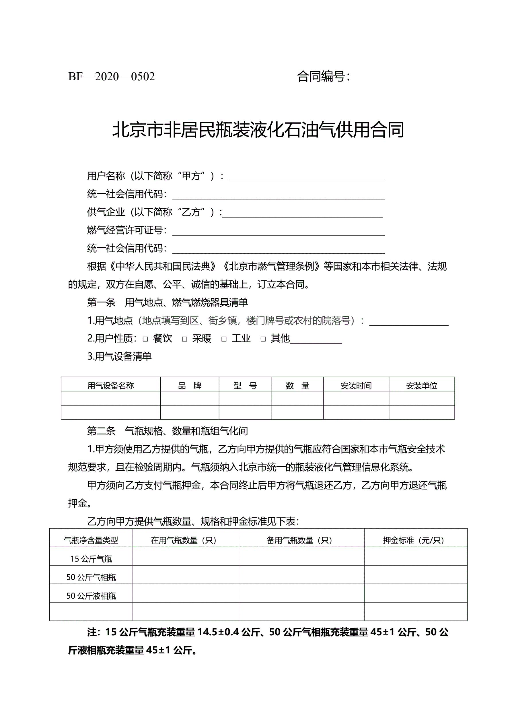 北京市非居民瓶装液化石油气供用合同
