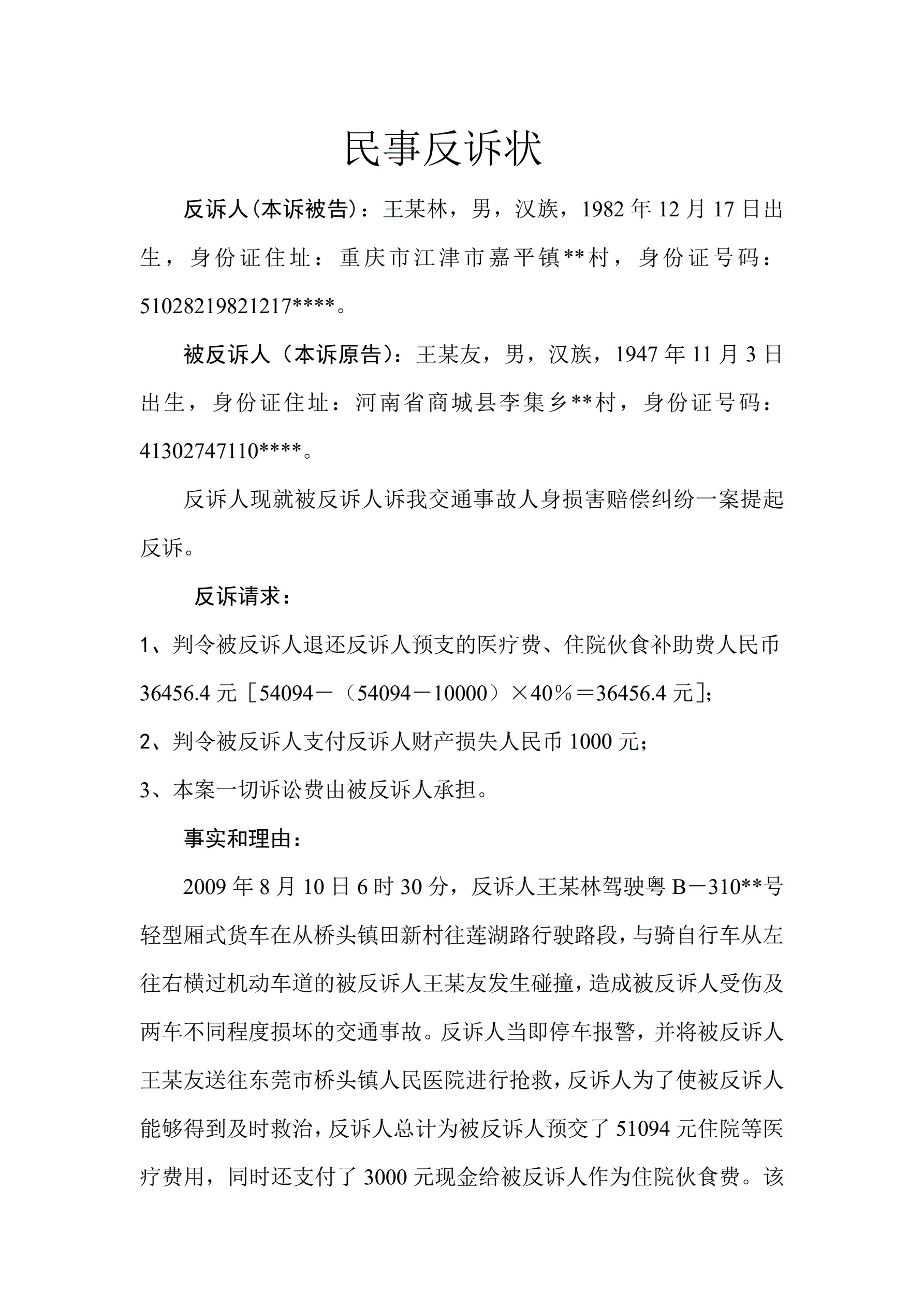 民事反诉状(王贞林)