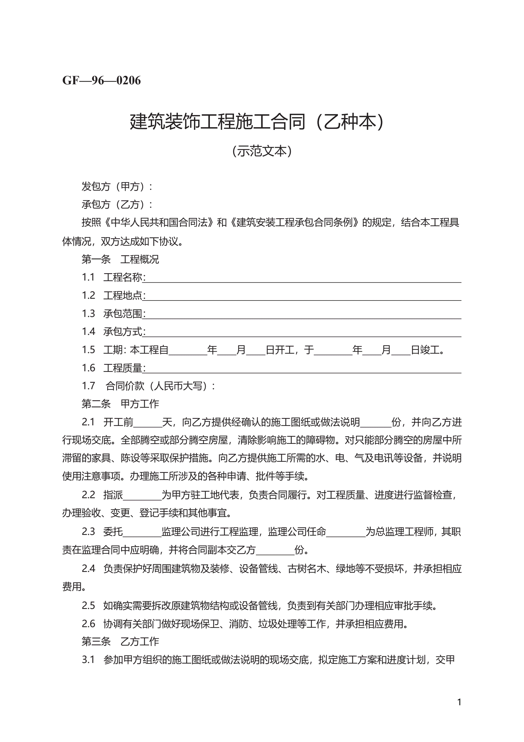 >建筑装饰工程施工合同(乙种本) GF—96—0206