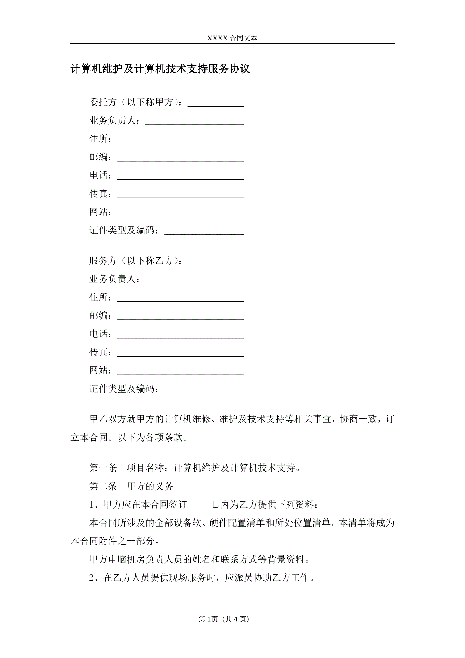 >计算机维护及计算机技术支持服务协议