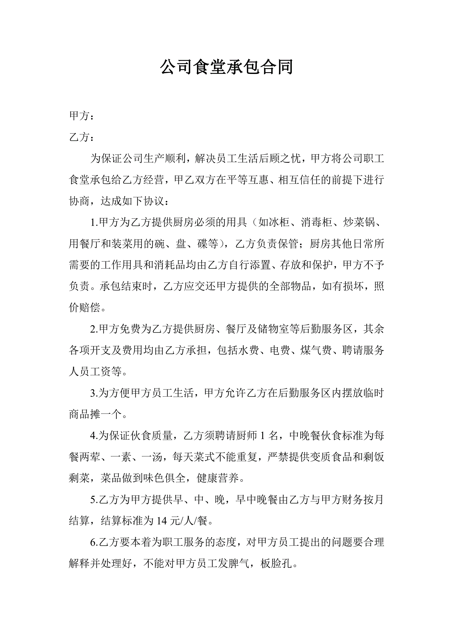 企业员工食堂承包合同