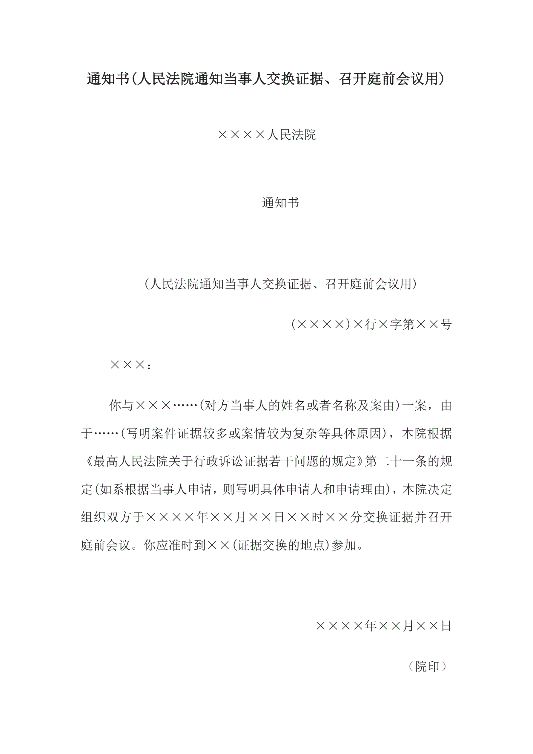 >通知书(人民法院通知当事人交换证据、召开庭前会议用)