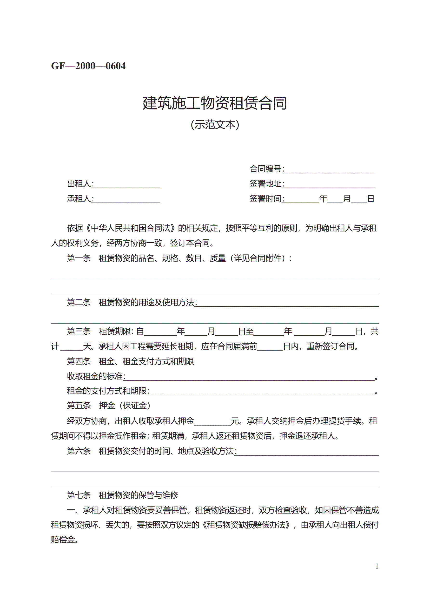 建筑施工物资租赁合同 GF—2000—0604