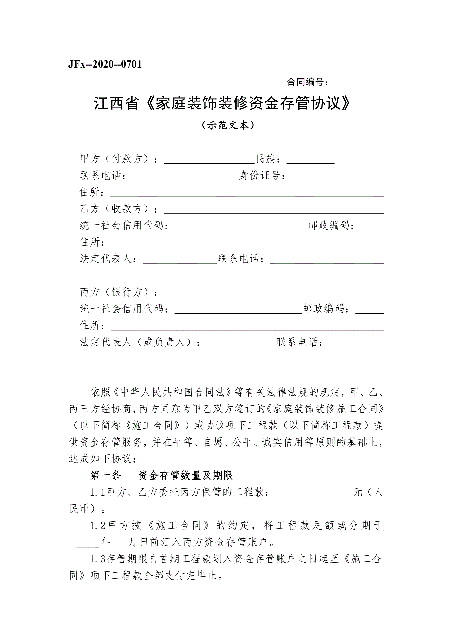 >12江西省《家庭装饰装修资金存管协议》