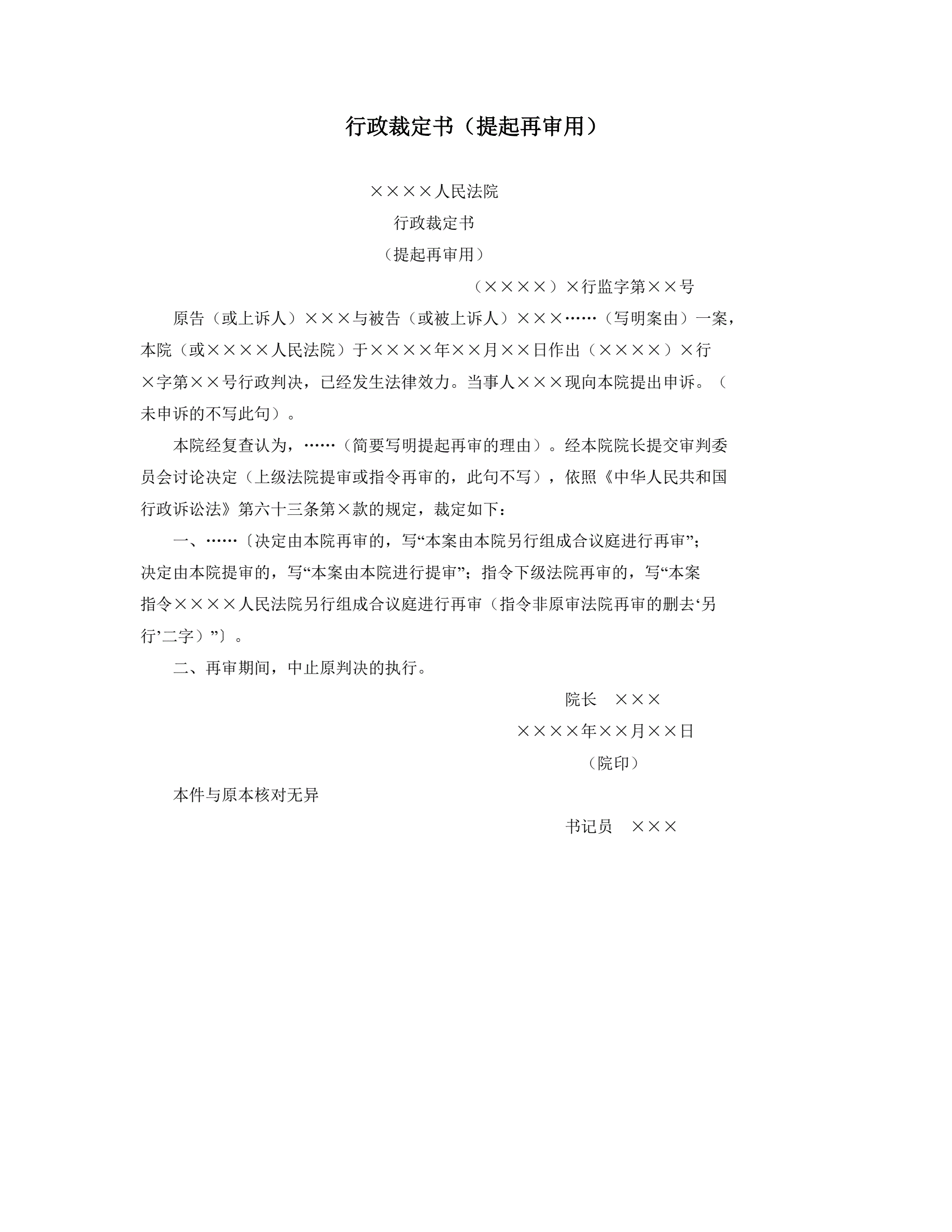 >行政裁定书(提起再审用)