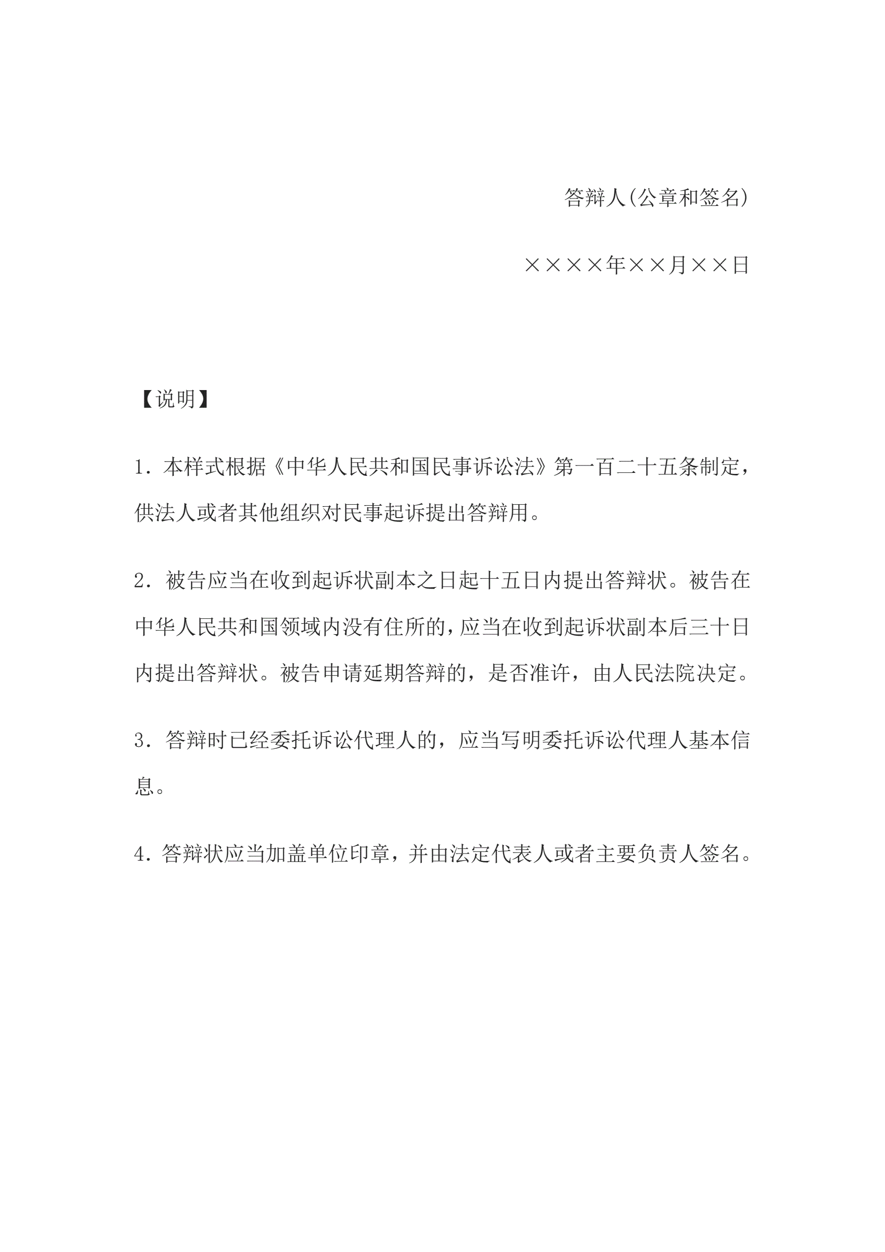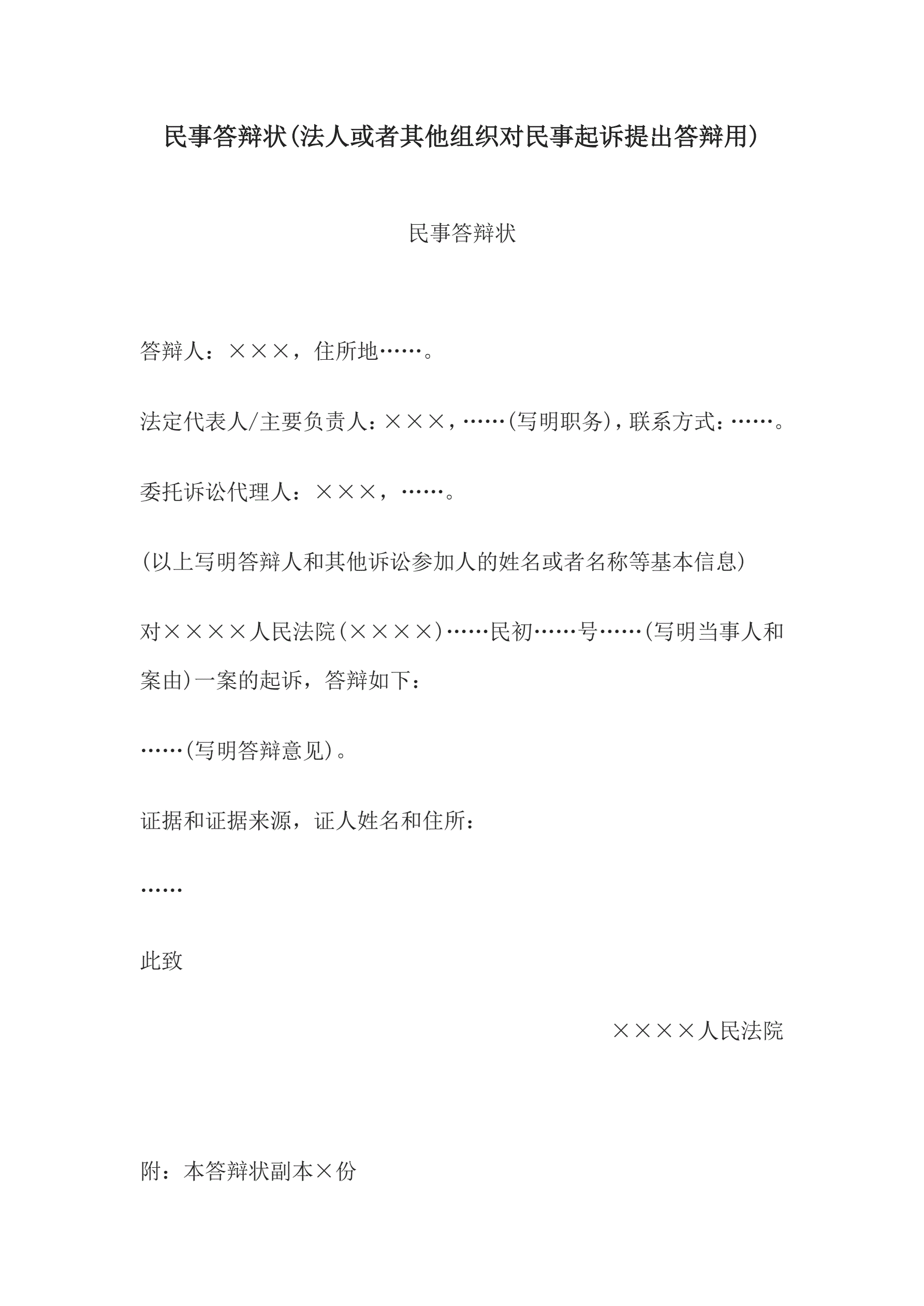 >民事答辩状(法人或者其他组织对民事起诉提出答辩用)