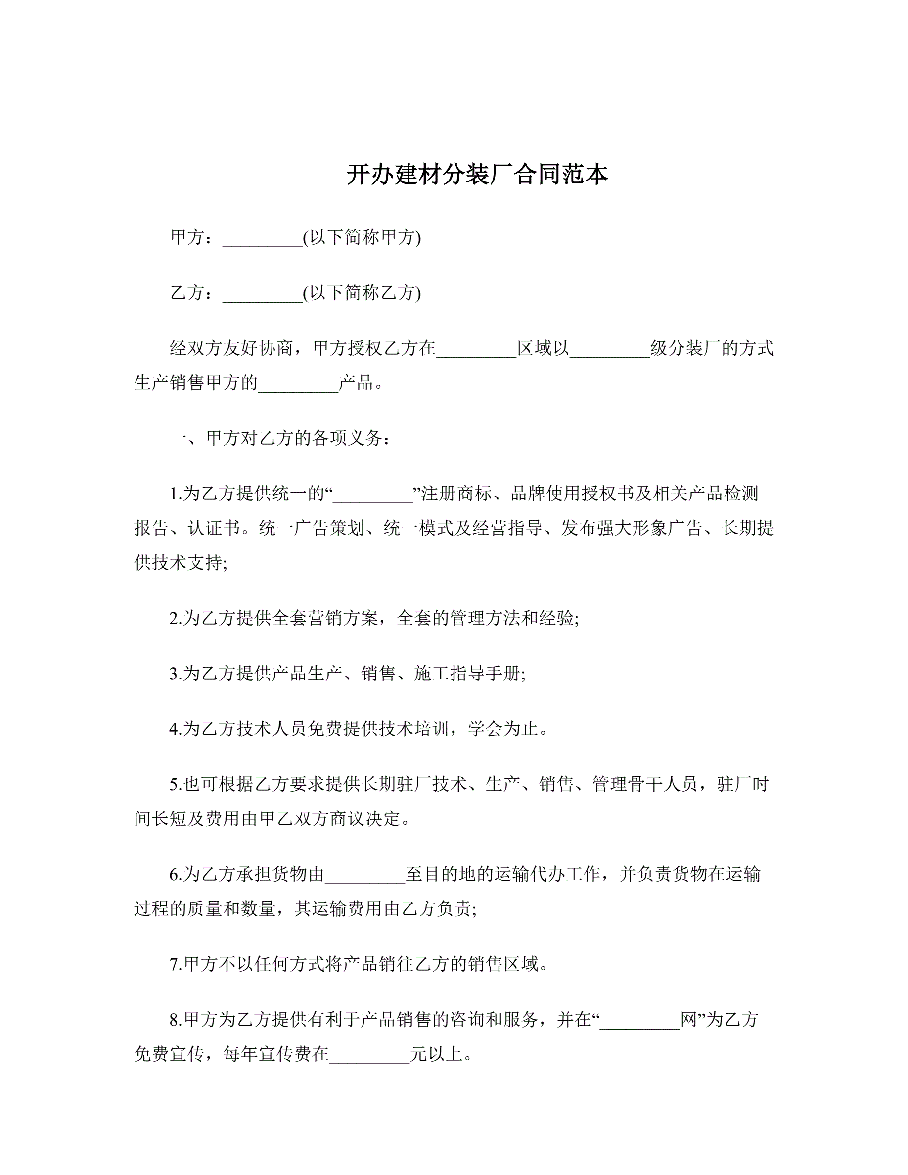 开办建材分装厂合同