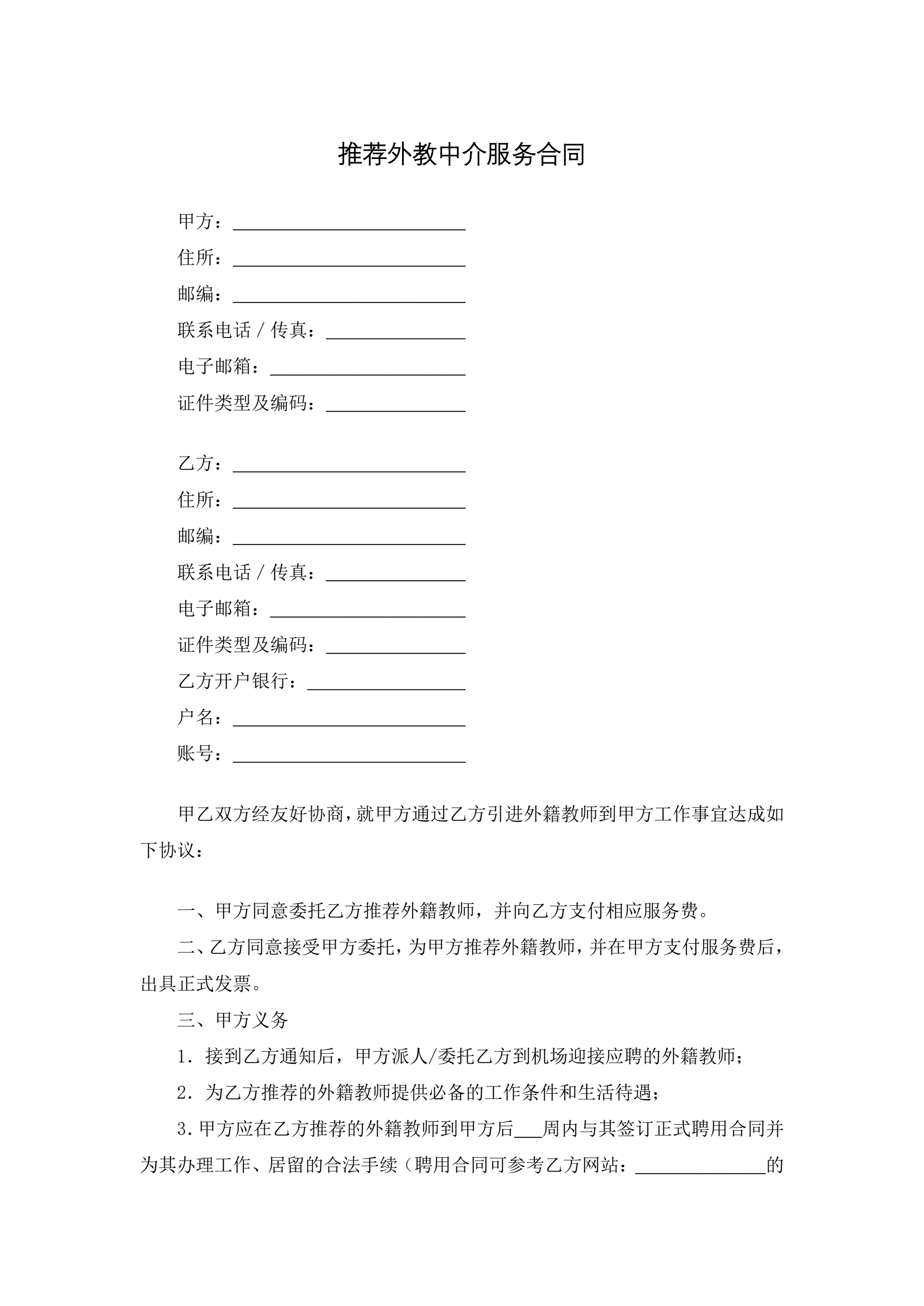 >推荐外教中介服务合同