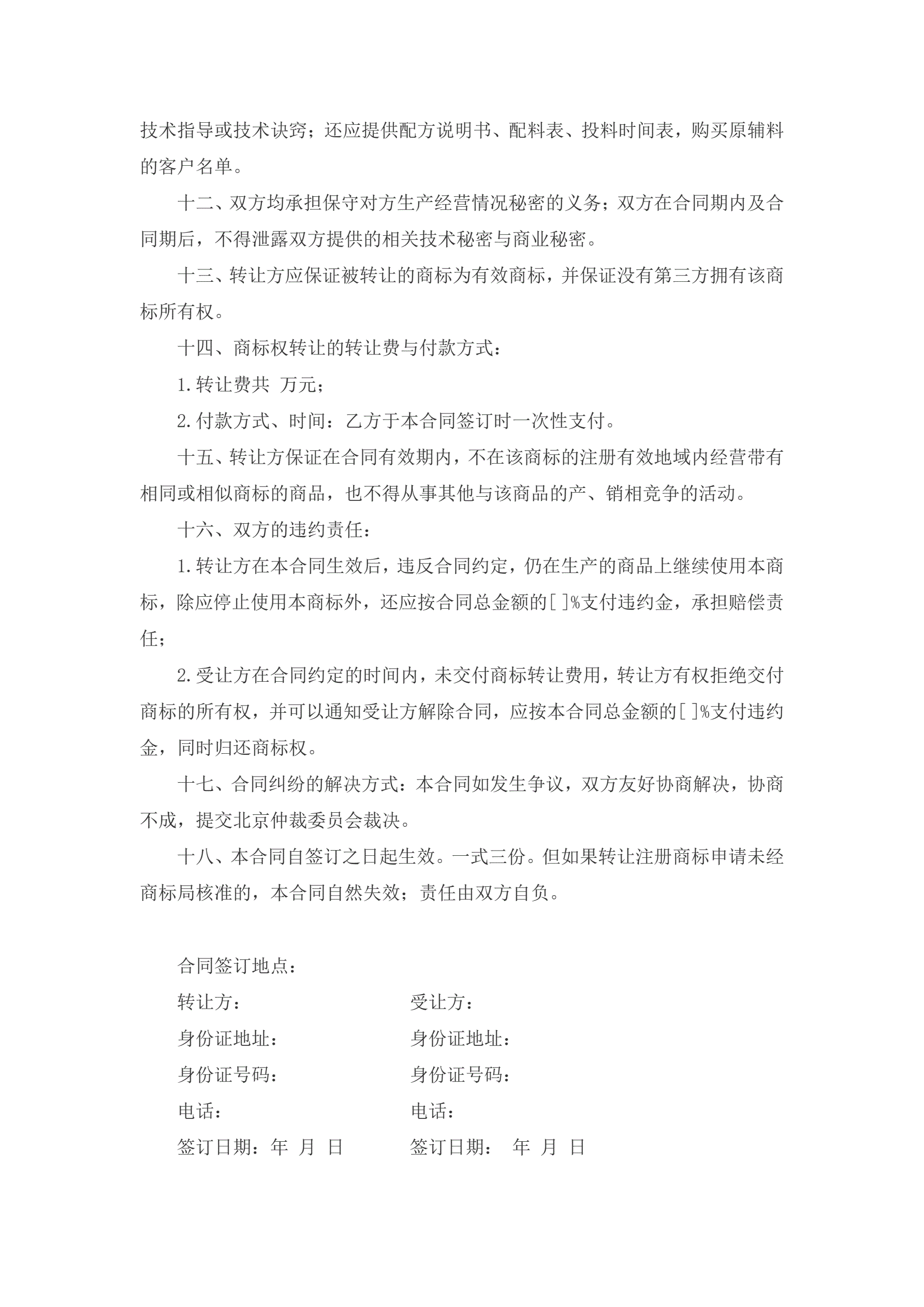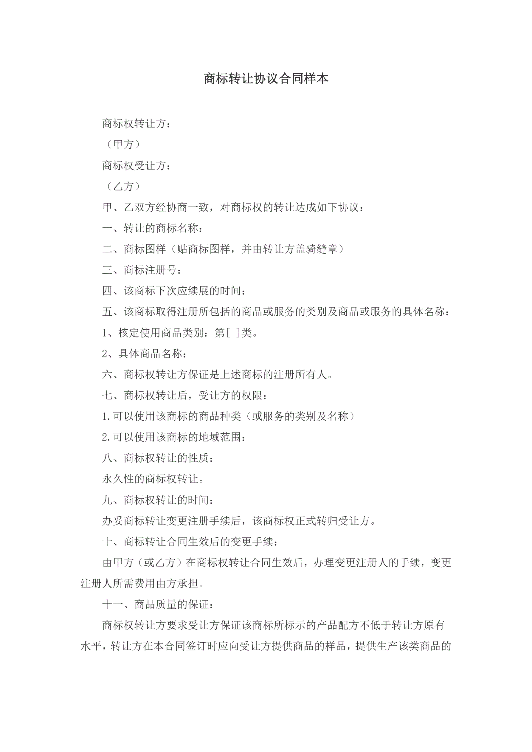 >商标转让协议合同样本