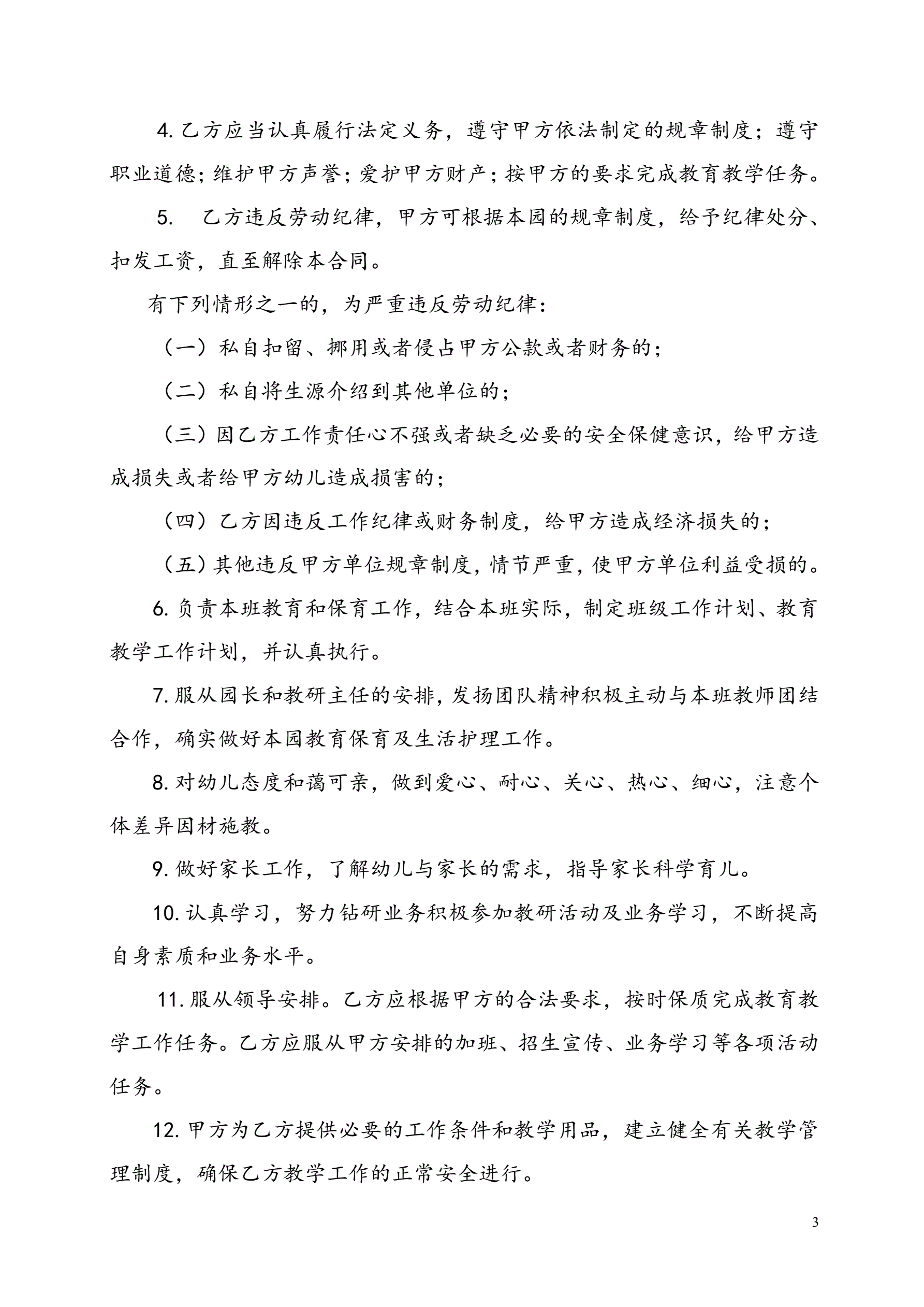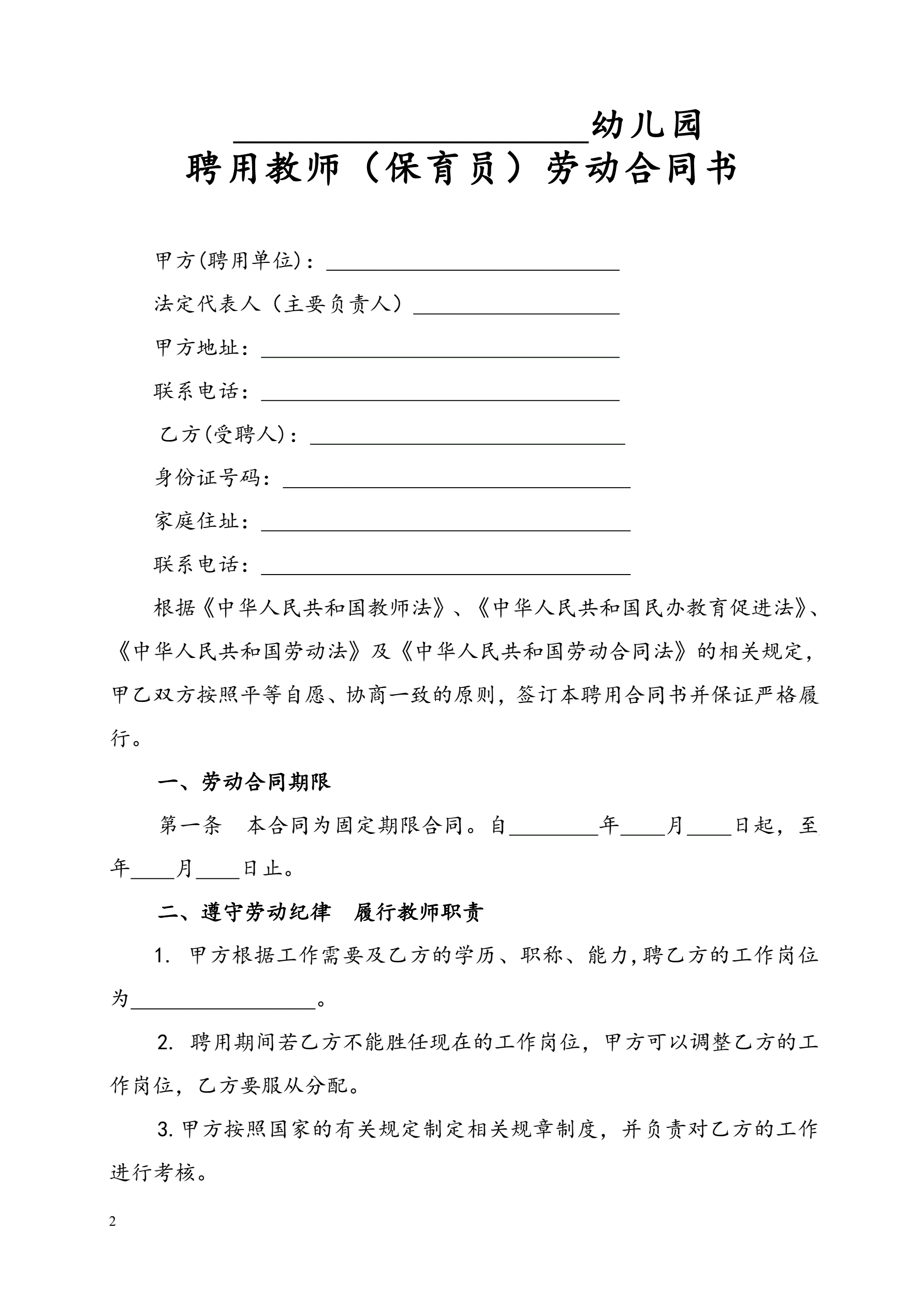 民办幼儿园劳动合同