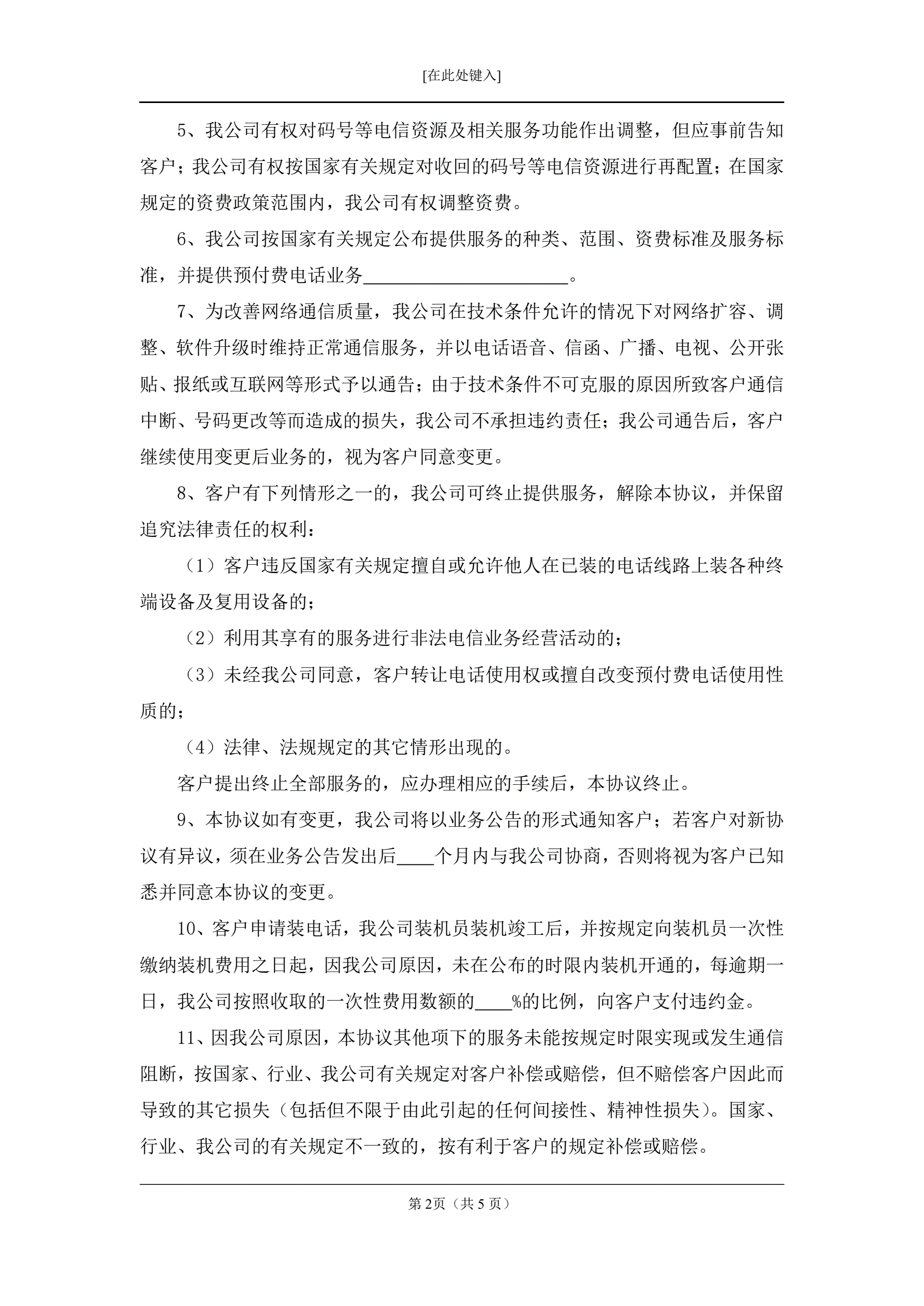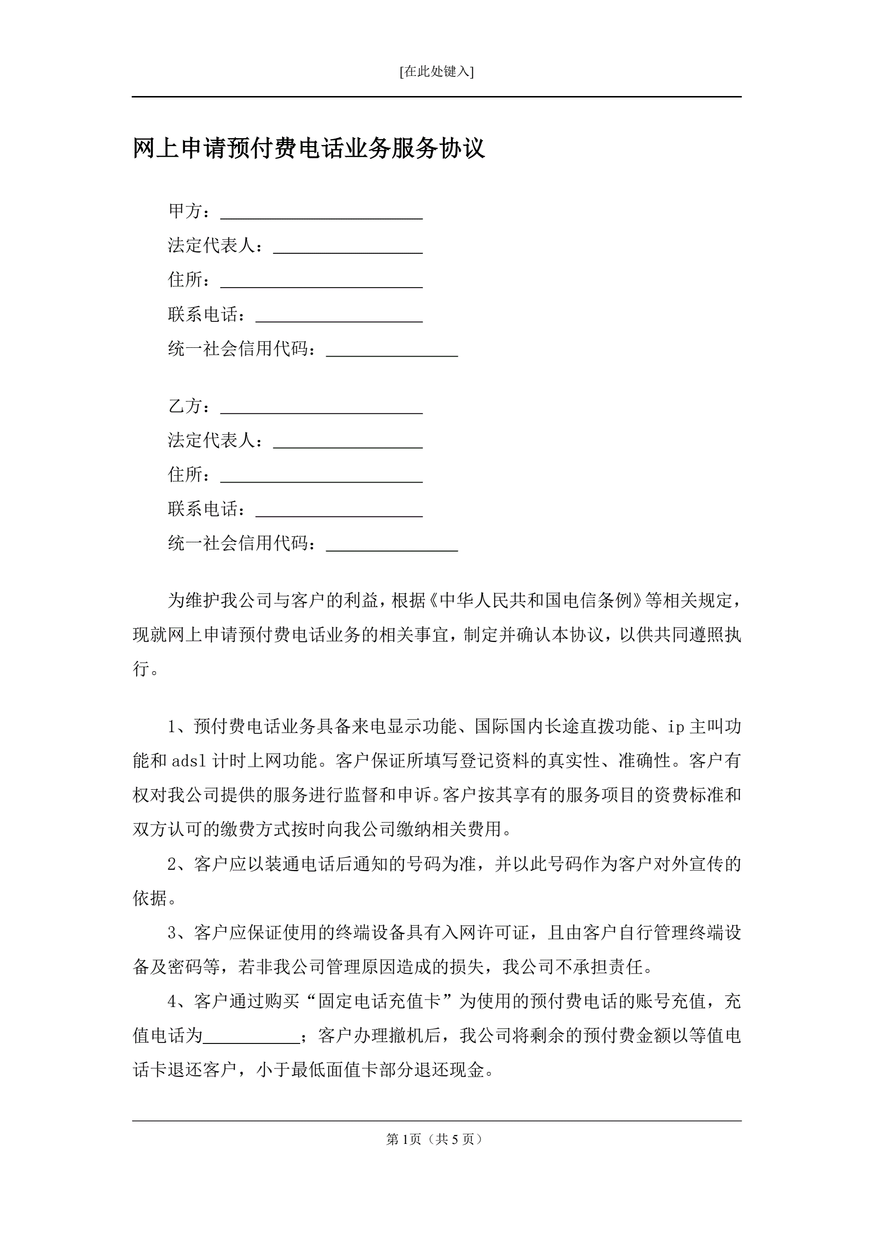 网上申请预付费电话业务服务协议