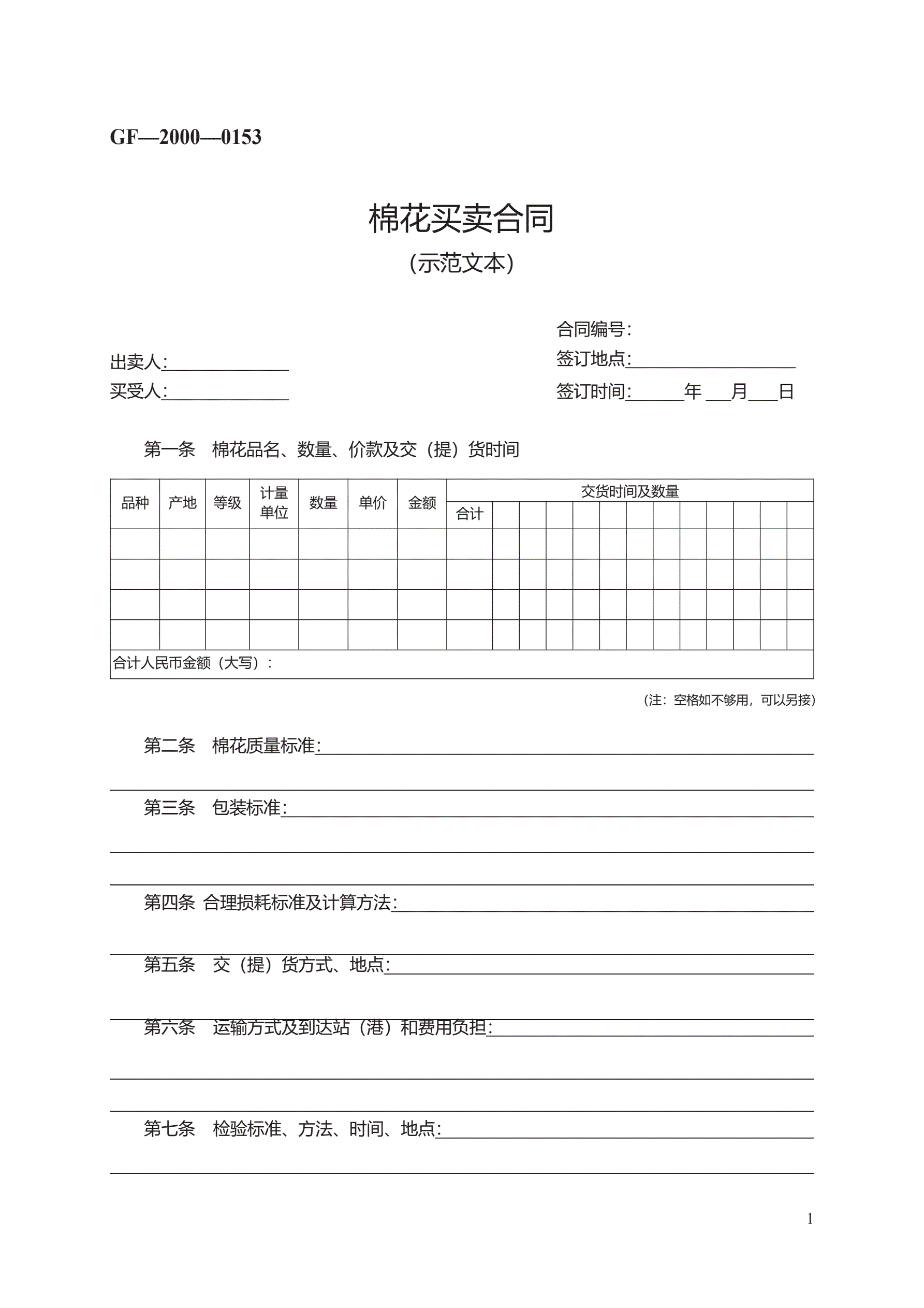 合同名称:棉花买卖合同 GF—2000—0153