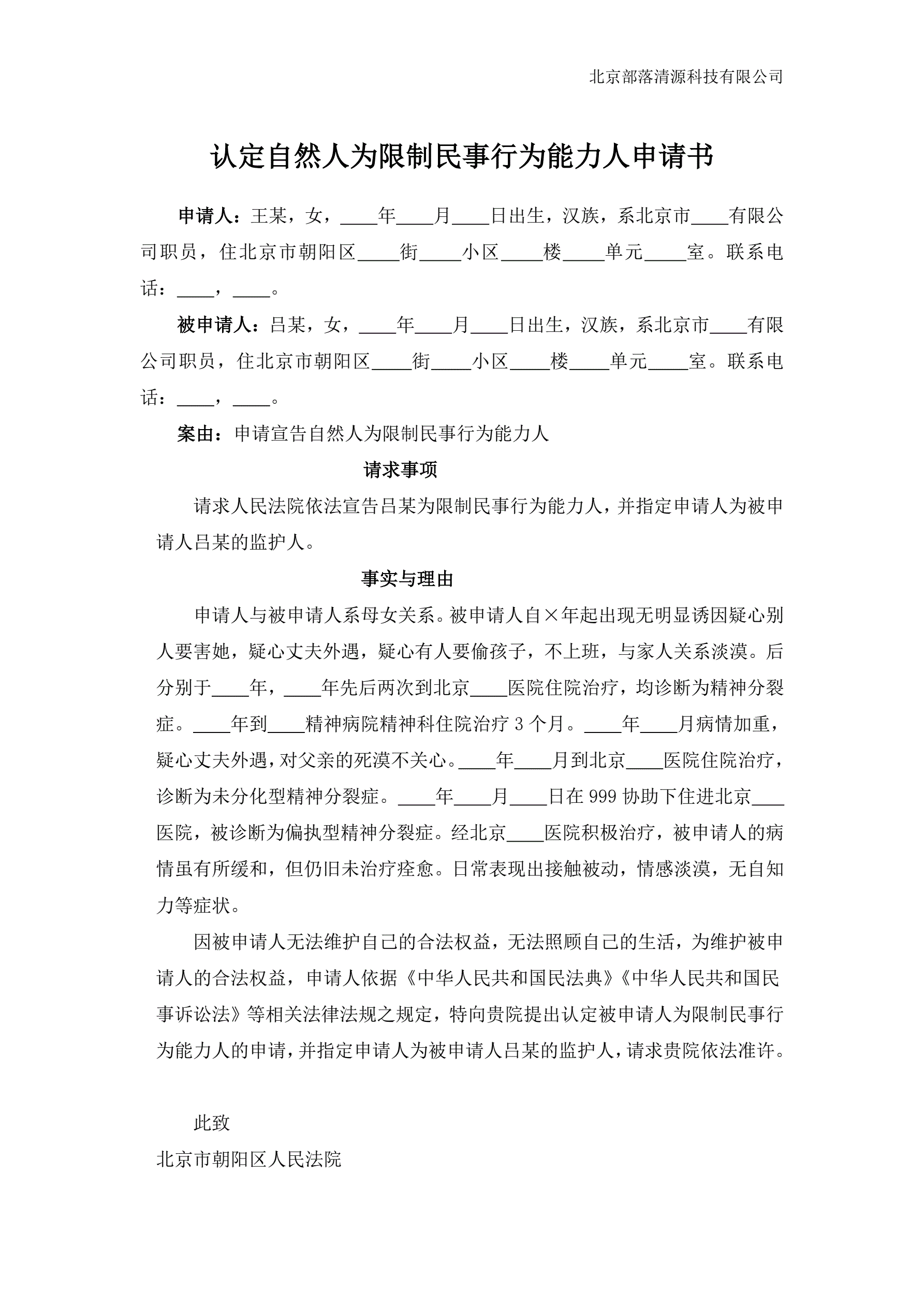 >认定自然人为限制民事行为能力人申请书